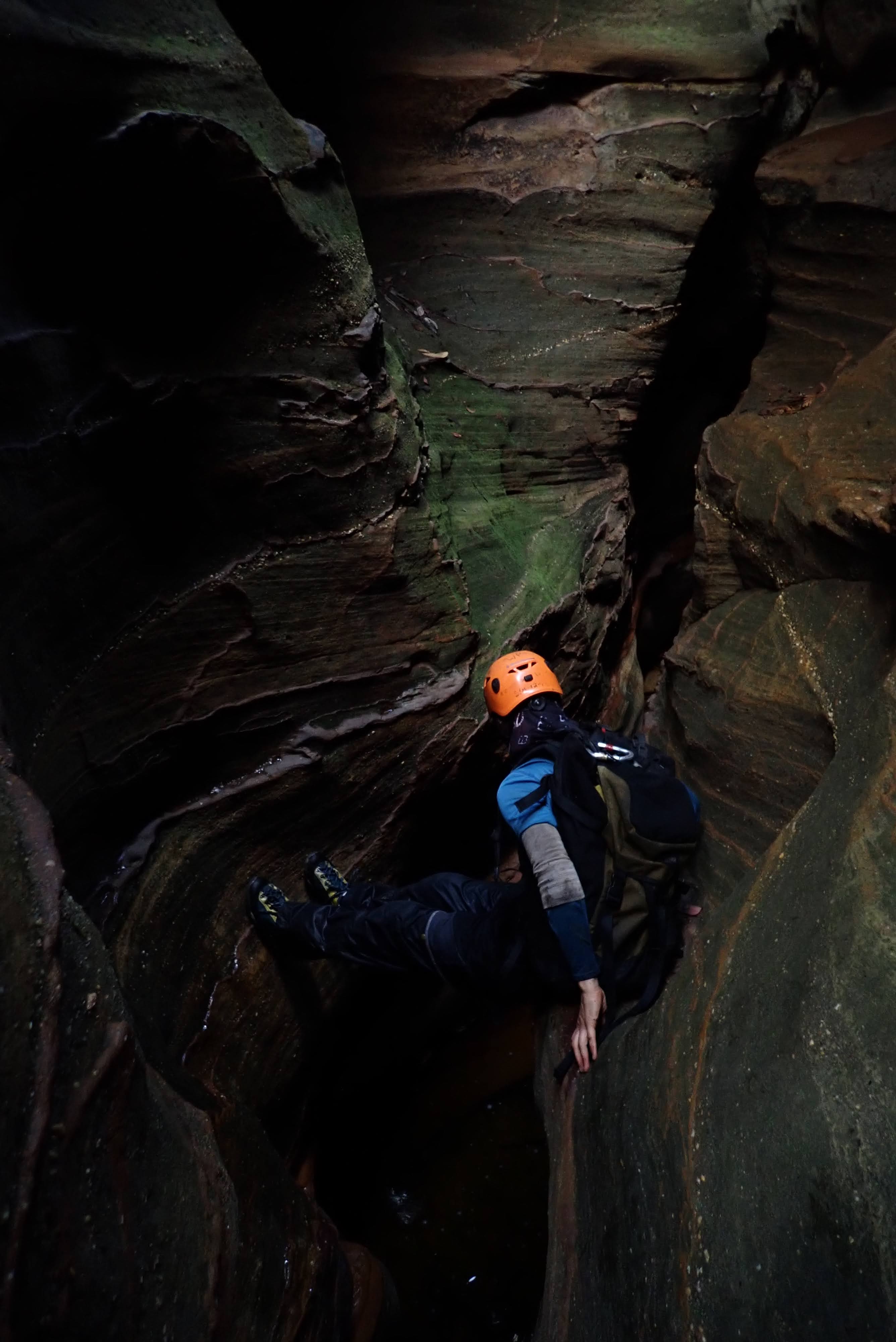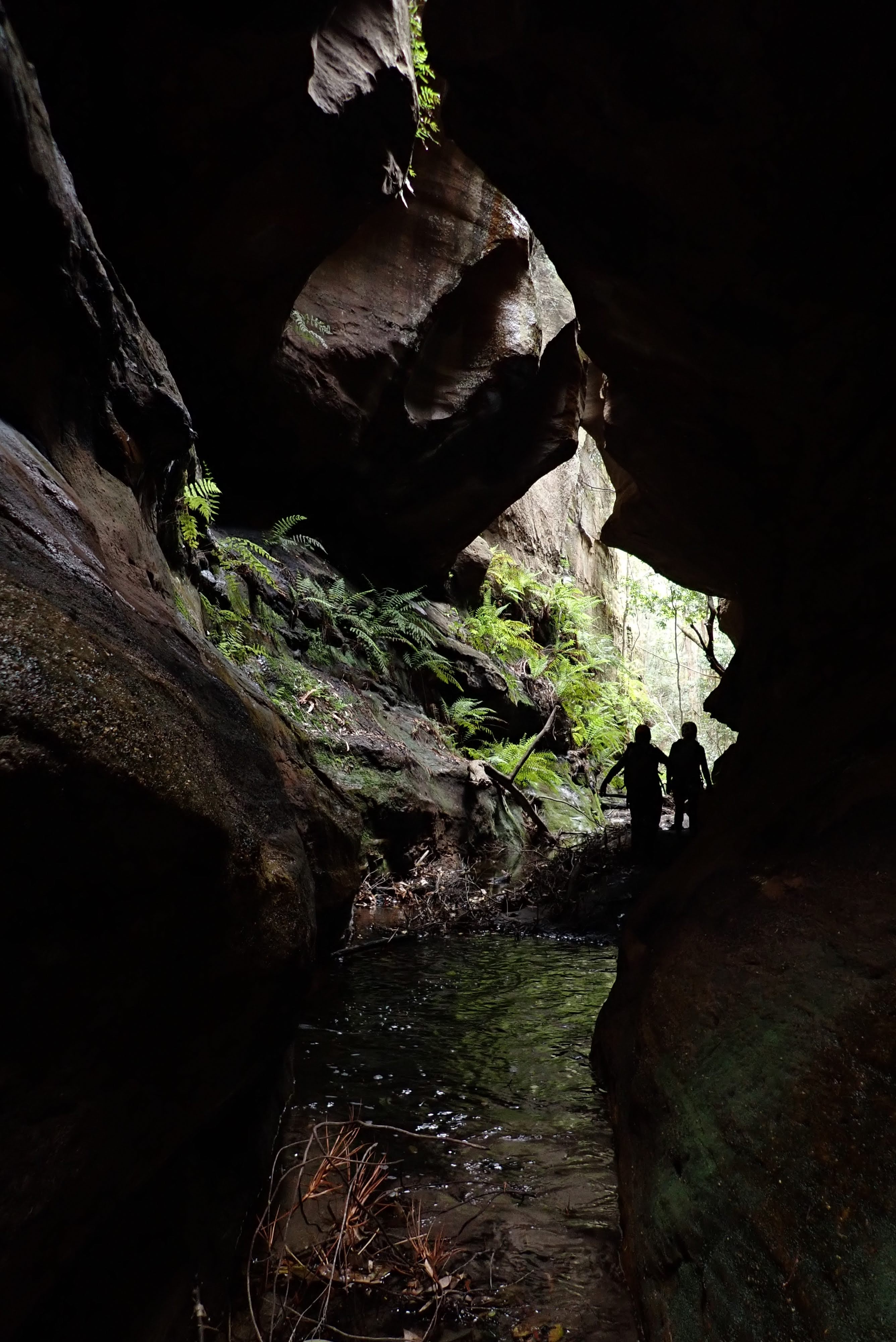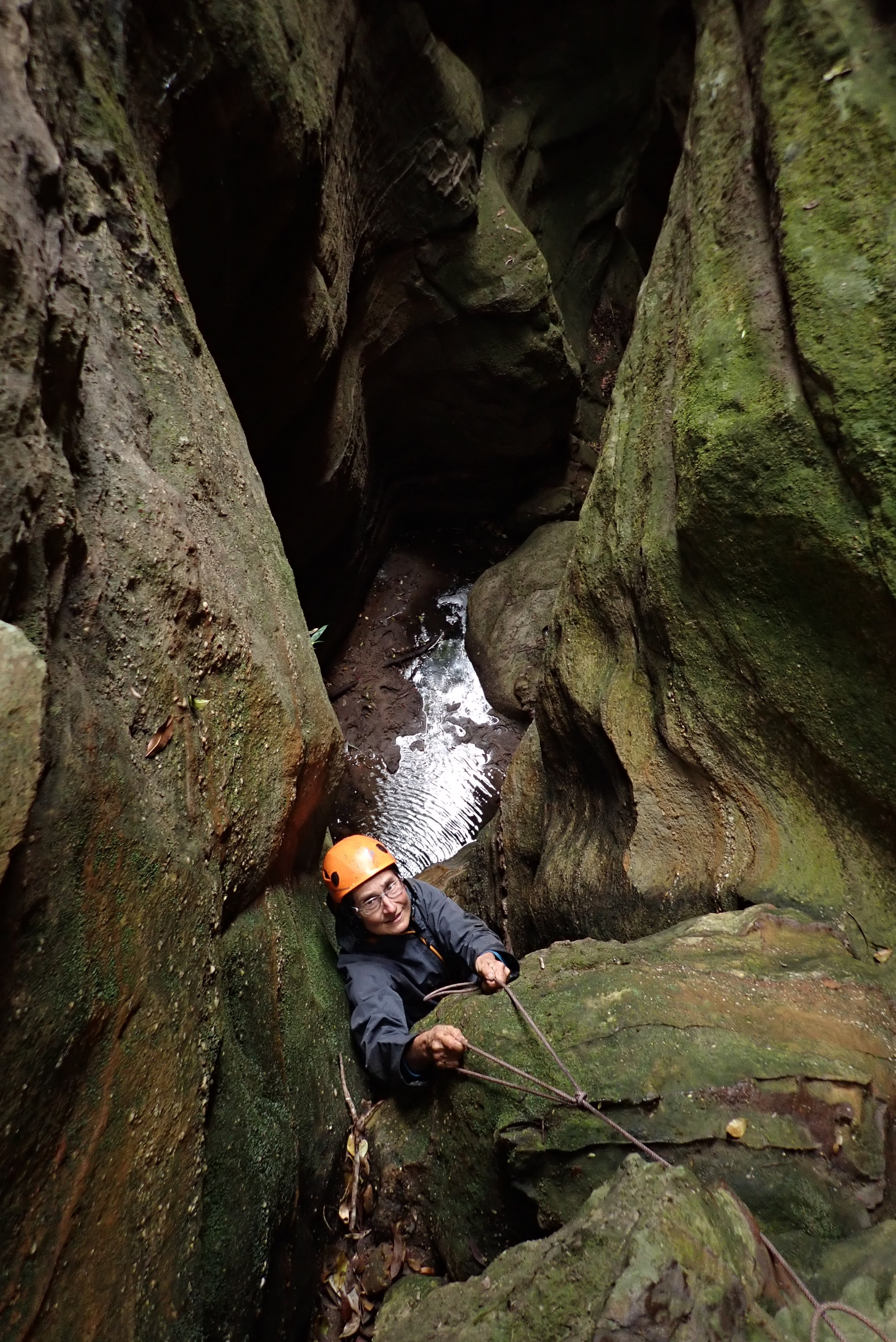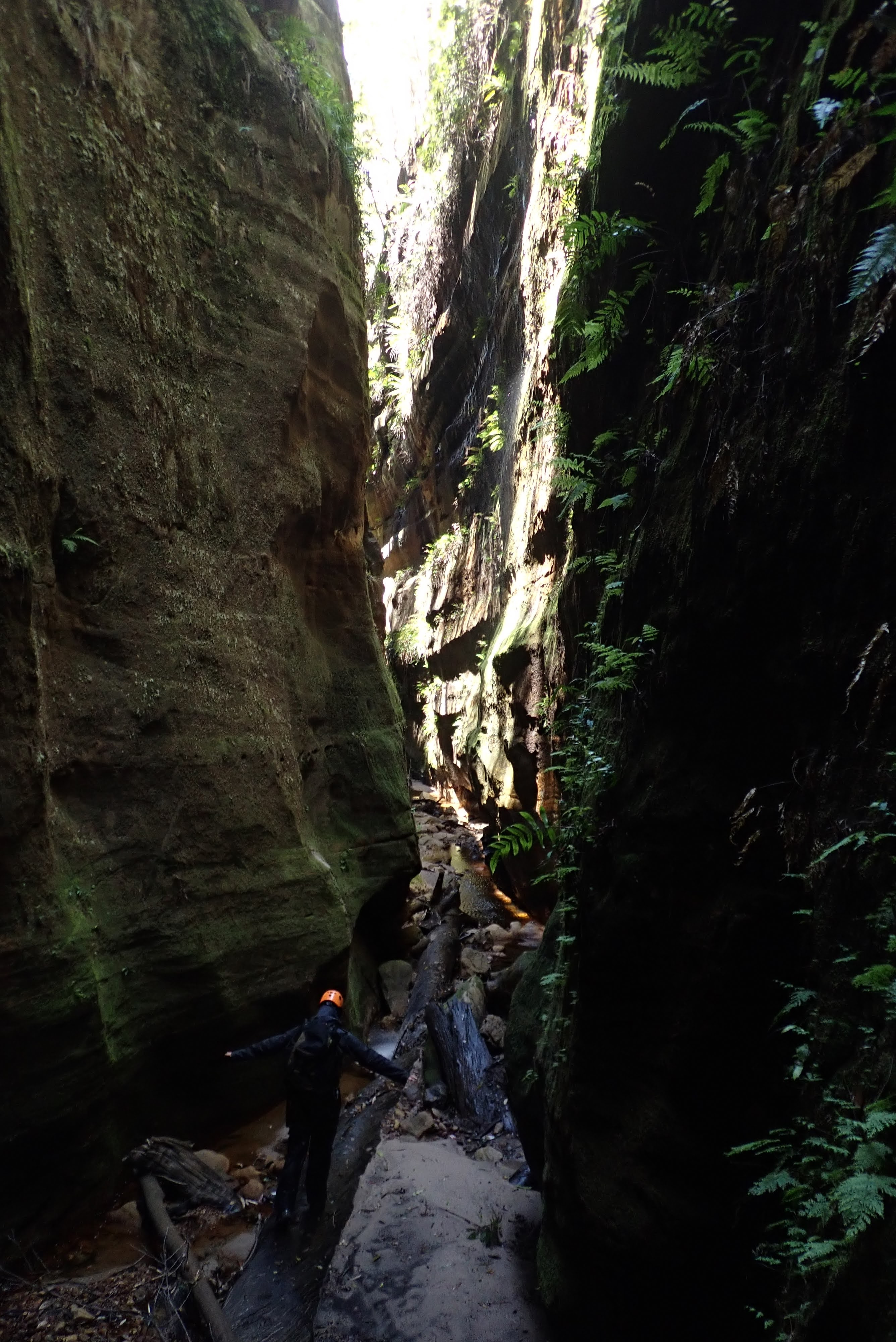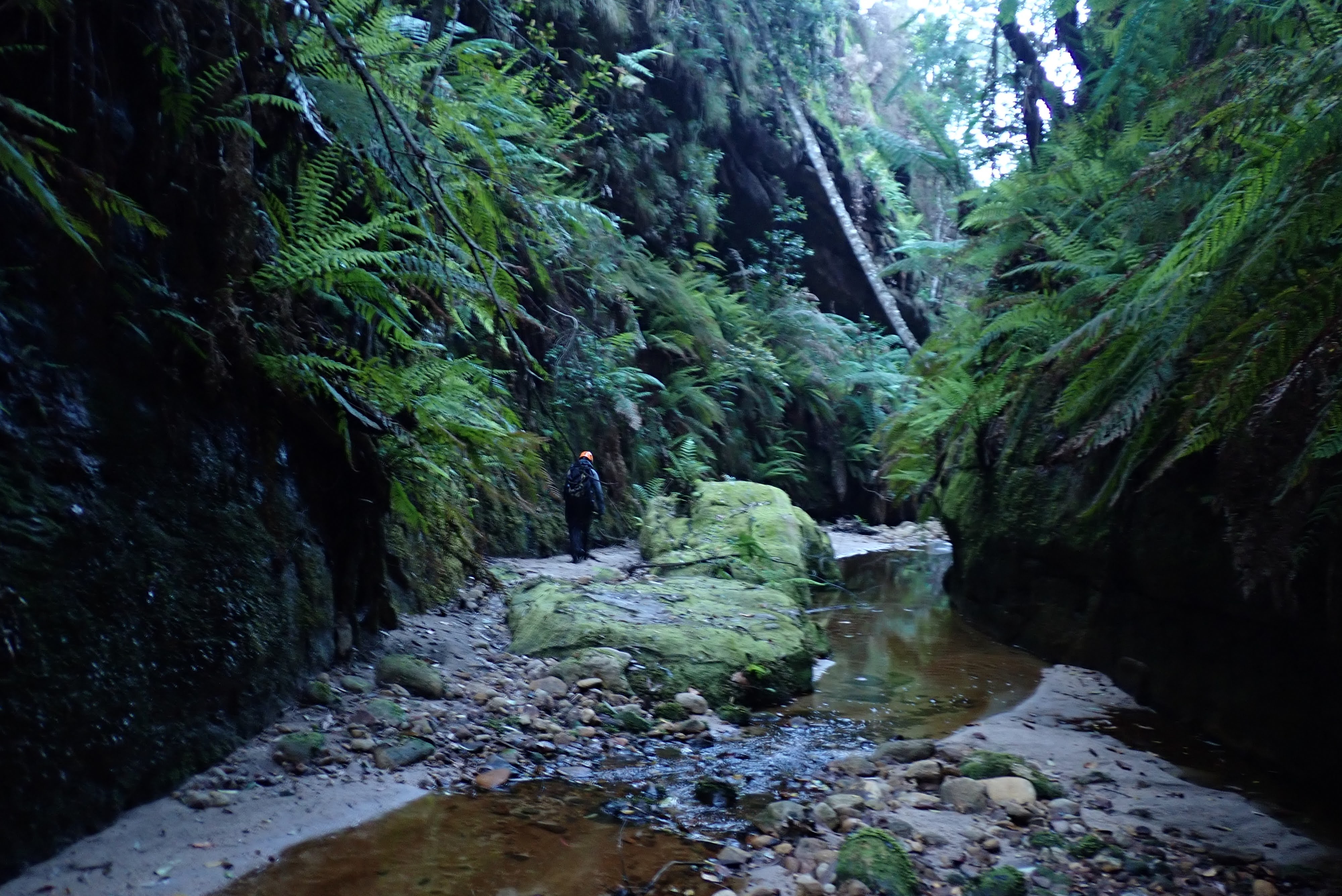 Following the humble creek down, we were surprised when it suddenly dropped into a large amphitheater. Should we abseil in? I was pretty sure you could avoid it. We continued around to the left until mum picked a nice spot for an abseil. Mum rigged it with a toggle and down we went. The previously foreshortened ferns and other vegetation seemed taller as we continued down. The creek narrowed a bit and then dropped into an even narrower slot. Narrow enough that chimneying down was easy enough. Up and over a well and truly stuck chockstone and then mum let me take the lead… It was hard to see, as the canyon again dropped steeply down, this time into a more complete blackness. Jamming myself in, I worked my way down and then out, dropping into some water that wasn’t as deep as expected and stepped gingerly across a deeper section. Passing through a narrow section that clung to my bag we emerged from our cave-like experience.