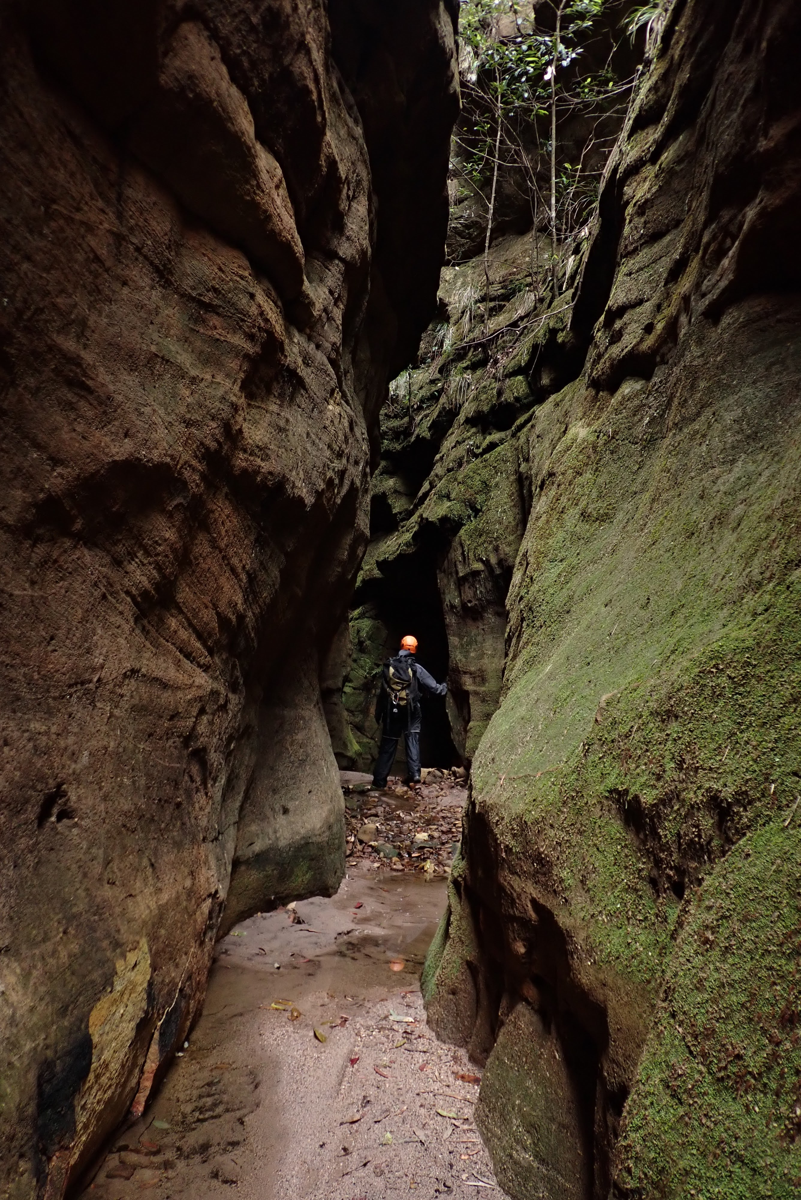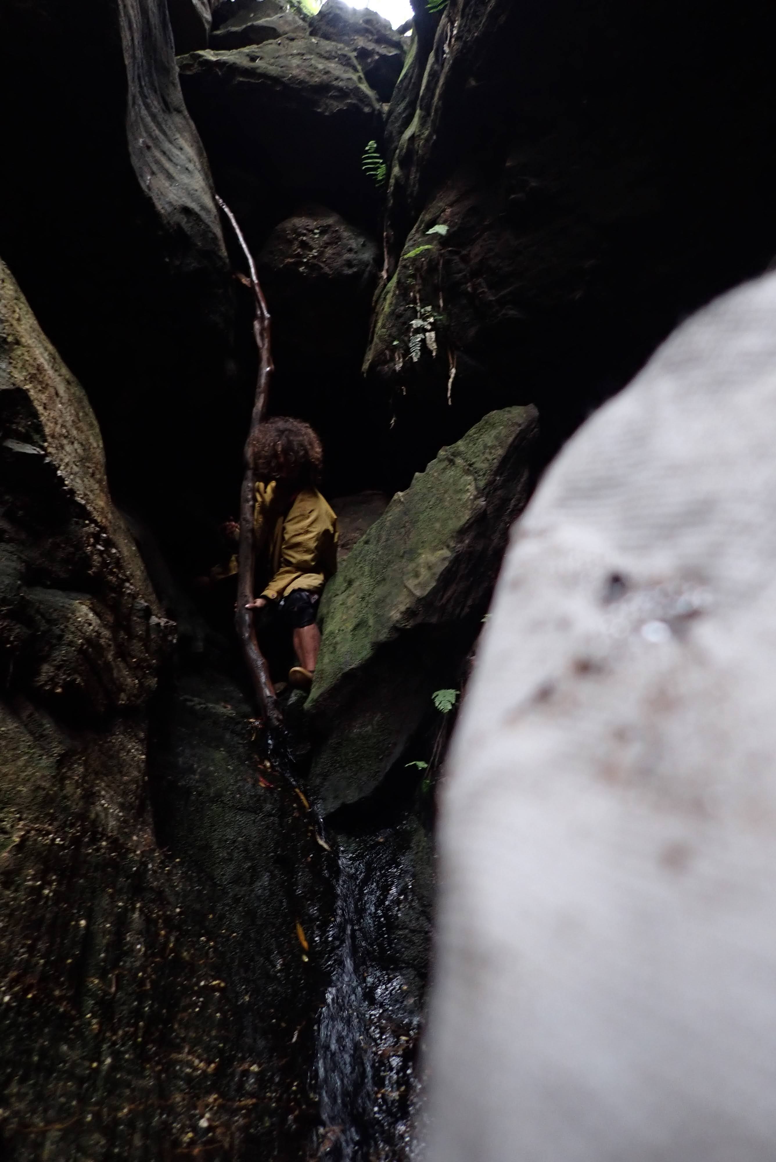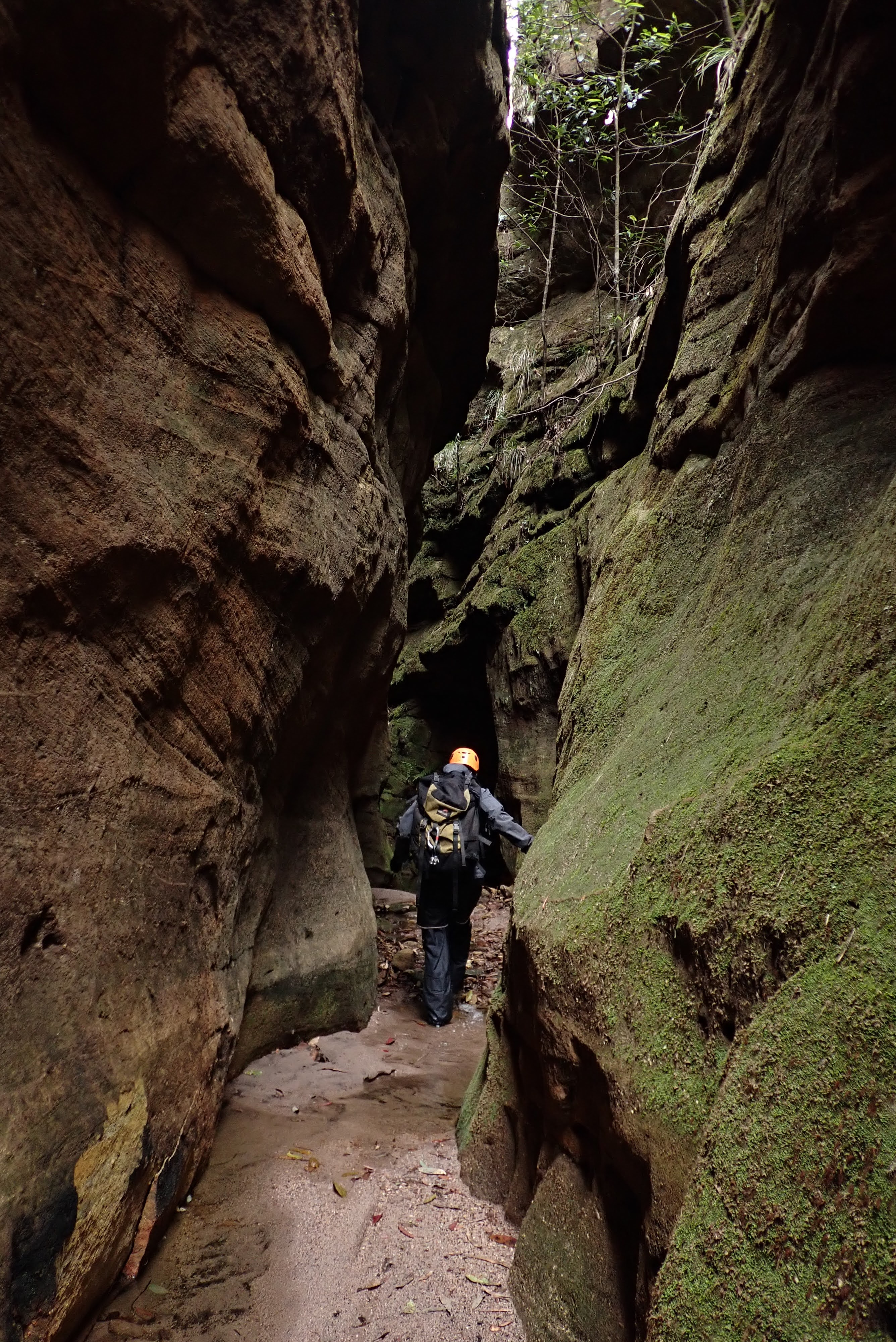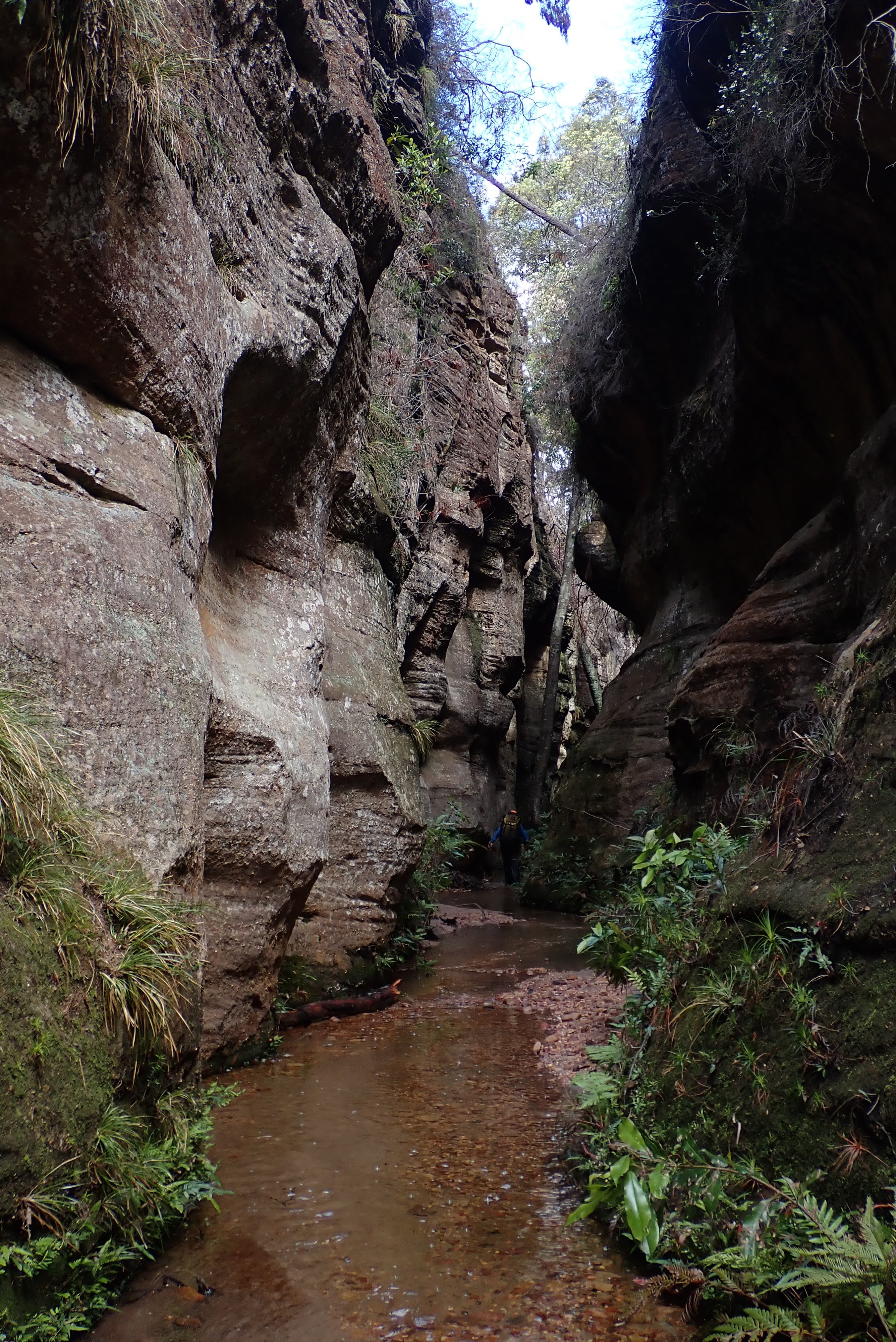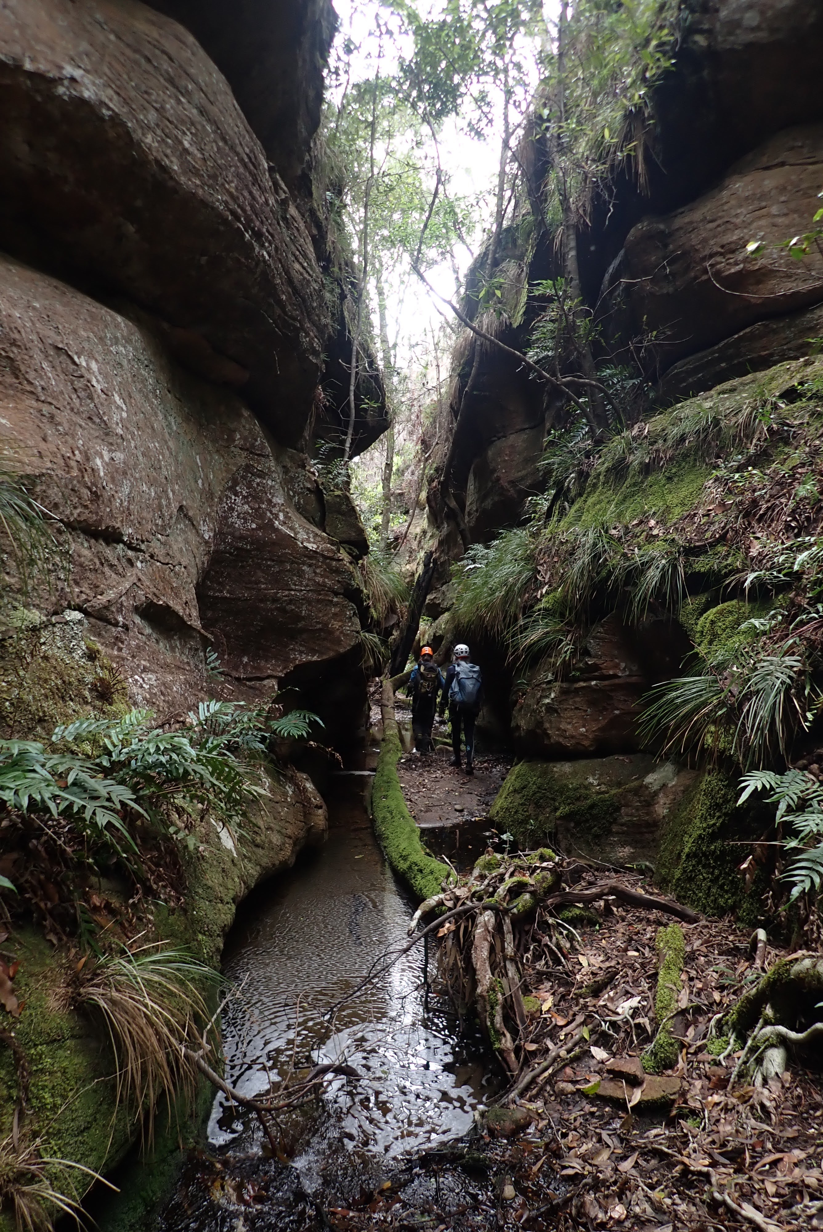 Following the humble creek down, we were surprised when it suddenly dropped into a large amphitheater. Should we abseil in? I was pretty sure you could avoid it. We continued around to the left until mum picked a nice spot for an abseil. Mum rigged it with a toggle and down we went. The previously foreshortened ferns and other vegetation seemed taller as we continued down. The creek narrowed a bit and then dropped into an even narrower slot. Narrow enough that chimneying down was easy enough. Up and over a well and truly stuck chockstone and then mum let me take the lead… It was hard to see, as the canyon again dropped steeply down, this time into a more complete blackness. Jamming myself in, I worked my way down and then out, dropping into some water that wasn’t as deep as expected and stepped gingerly across a deeper section. Passing through a narrow section that clung to my bag we emerged from our cave-like experience.