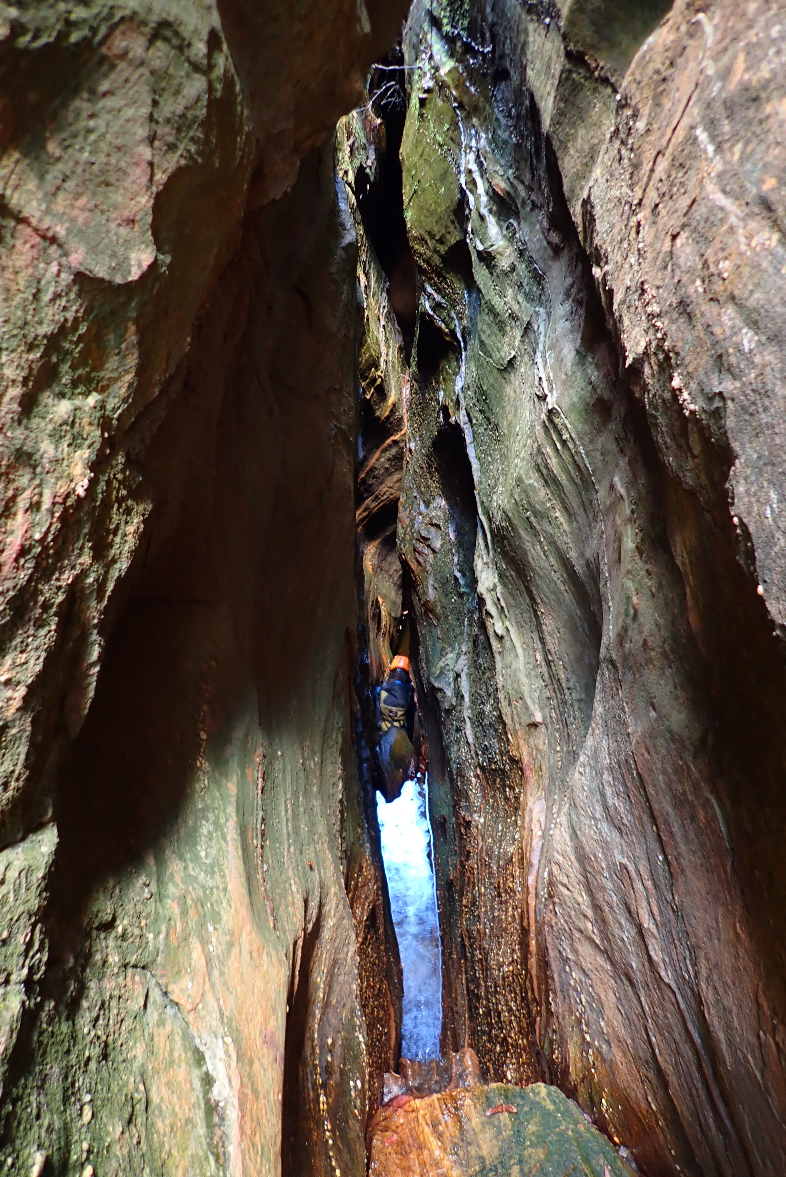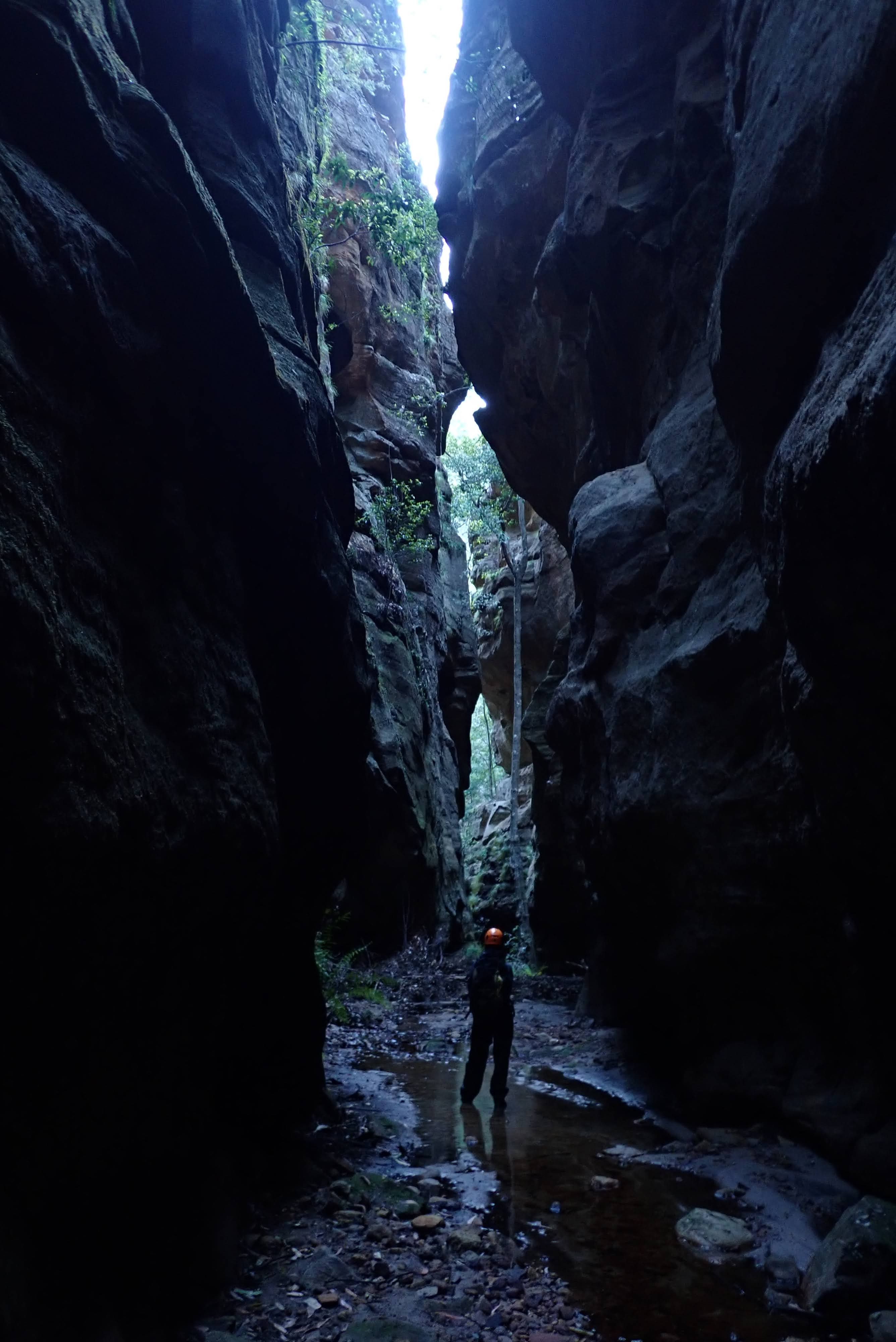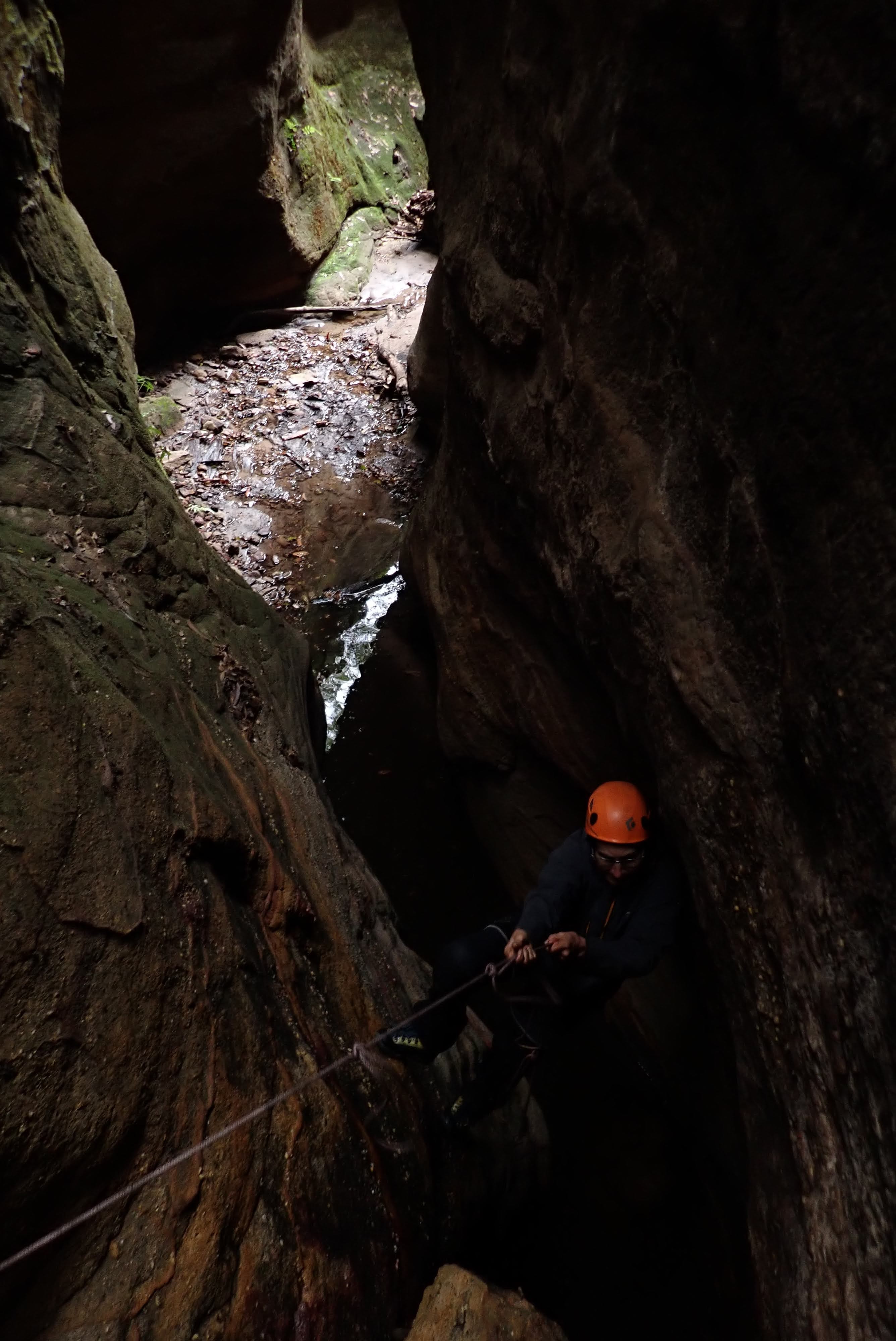 5-10mins later was a similar looking set of boulders, but this time it was much further down. Time to get our harnesses on. It was easy enough to abseil down through a hole, despite the low hanging anchor that was already in place. Not much further on the creek dropped into a dark and narrow slot. A rock chocked into the canyon meant the pull wouldn’t be particularly easy, but a chockstone further down the slot was reachable and would make for an easy time of it. I went last, and as it turns out did have to chimney up to retrieve the rope.