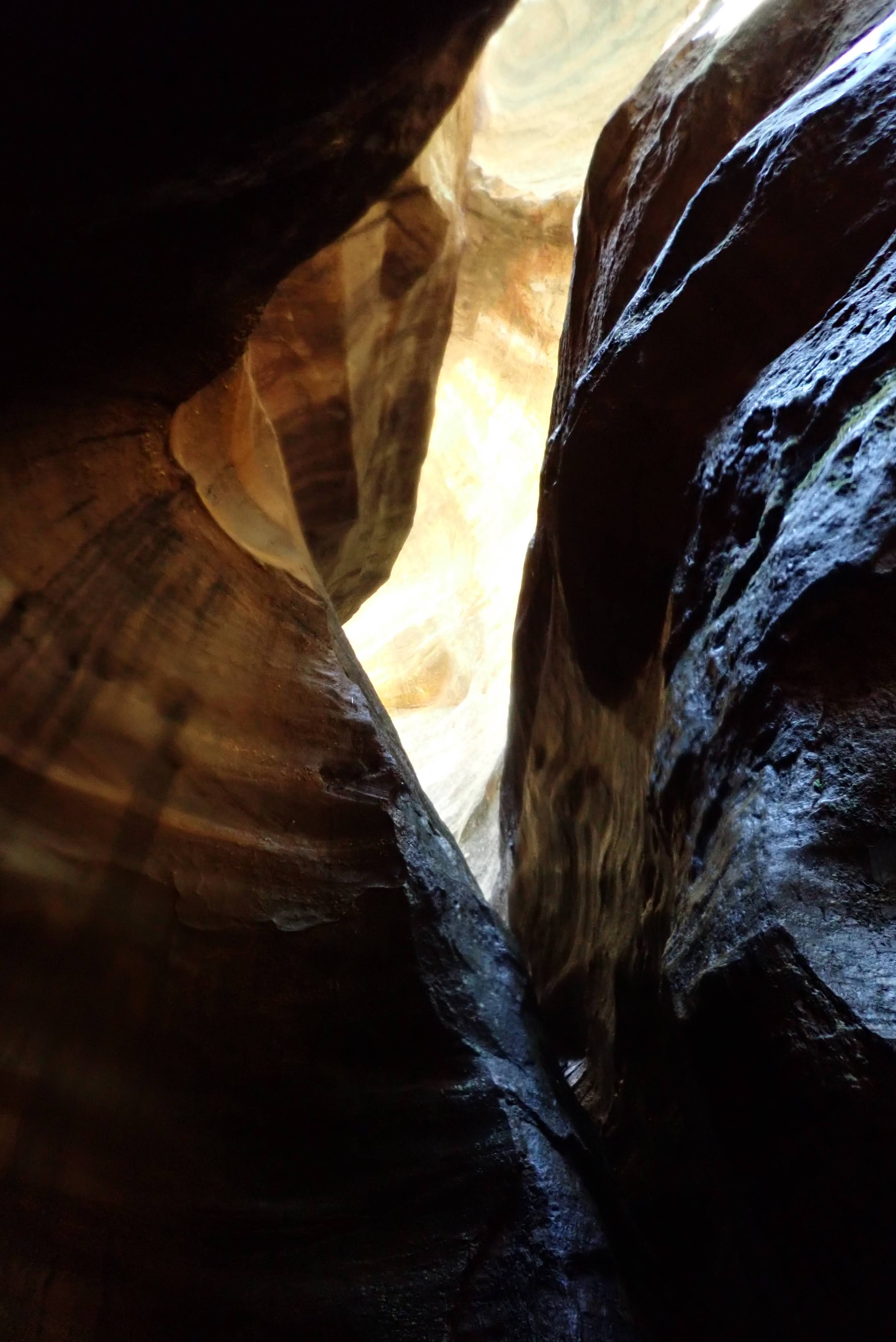 A drop soon followed. Mum abseiled down using me as an anchor to land in a pool with a dead snake. I chimneyed down the first bit but traversed out over some boulders to avoid the last slippery bit. Around the corner was an amazing cathedral, light bouncing off the walls in subtle shades of earthy yellows and oranges. We admired this from various angles before continuing down canyon to a drop were we both abseiled off a cantilevered log. A nice sinusoidal constriction and again the canyon dropped into a black slot. This one perhaps narrower than the first. It looked tight! In the end we bridged over the top before sliding down at the end.