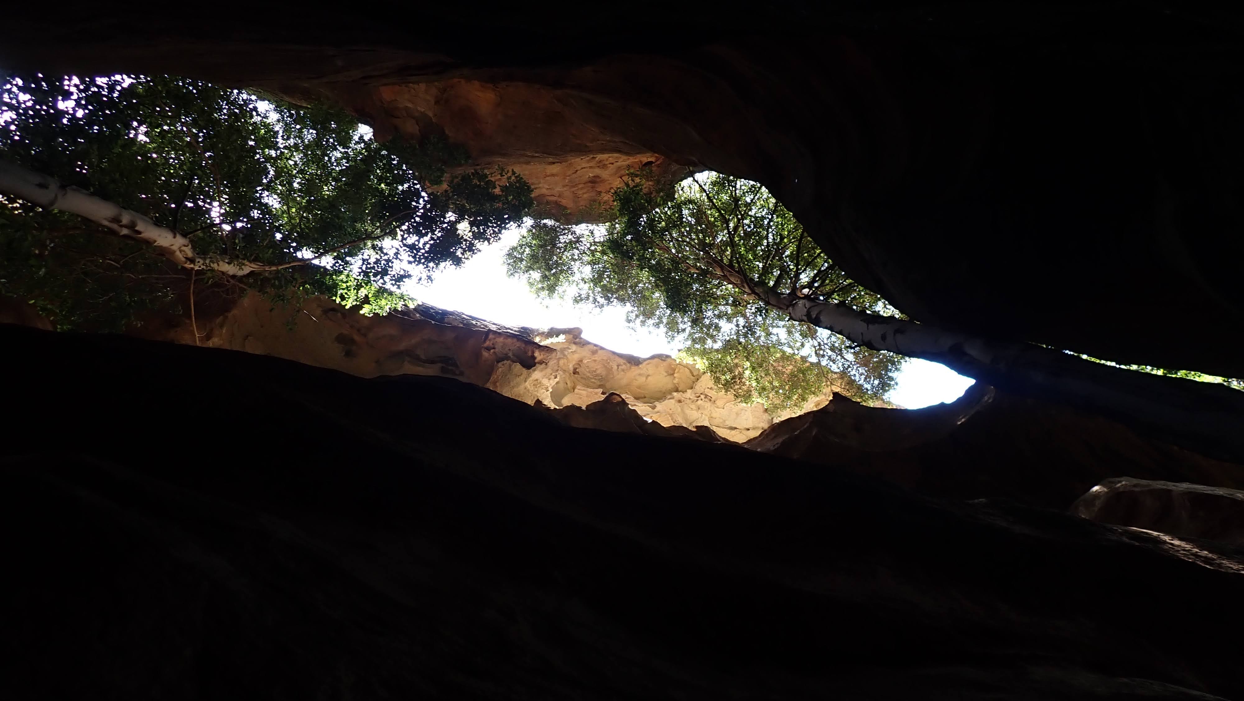 Further on, I got my phone out surprised to have far better reception than we have at our family house. Monika had sent me her new grid reference. We’d past there camp by a couple of hundred metres less than an hour ago! What to do? It’d be nice to meet up we thought. Scouting around we found a somewhat sheltered camp below a small rock outcrop. After settling in on a giant rock sarcófagos I shouldered an empty pack with empty water bladder and headed back down to find them. On the ridge I took, I found a surprisingly deep sandstone cave that would probably escape even the worst storm.