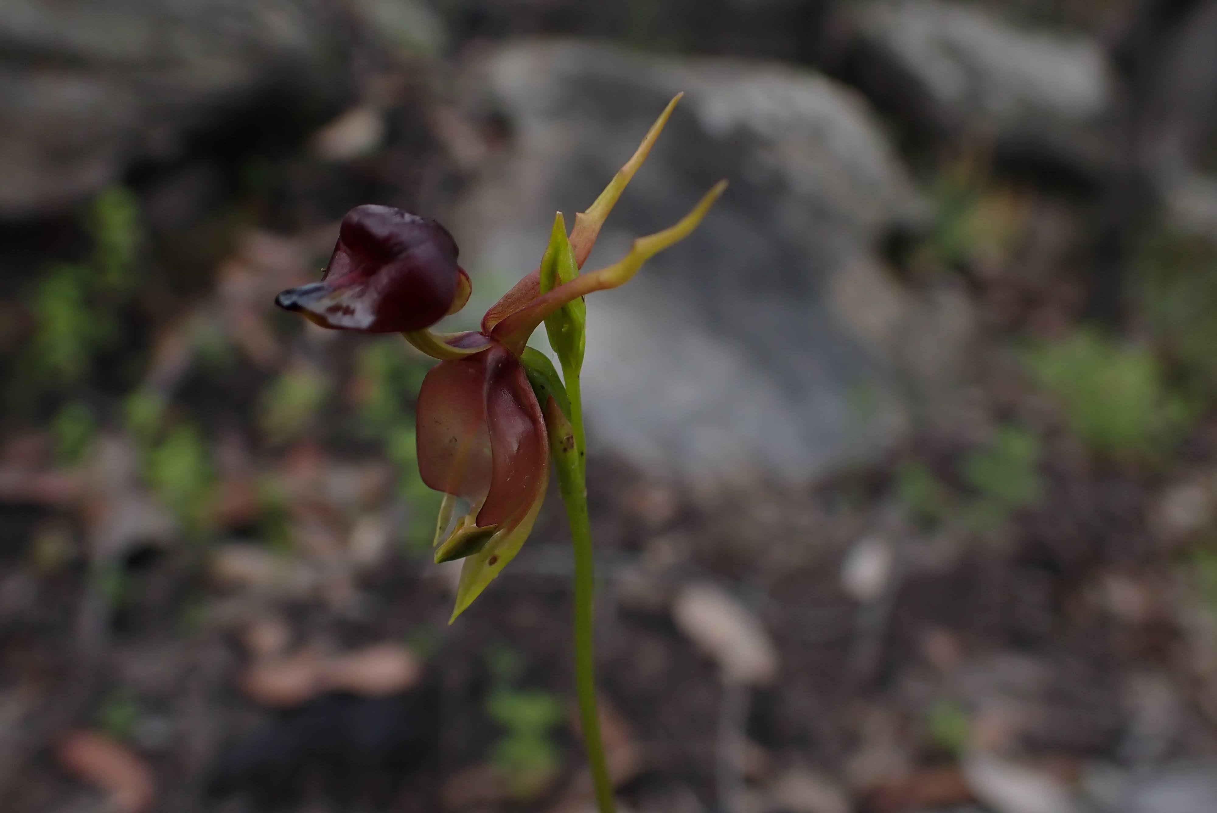 Crossing the flats I found more and more flying duck orchids making me wonder if I walked around with my eyes closed most of the time. I think maybe I’m searching for terrain features for navigation most of the time. Perhaps the planar landscape meant I had more time to look at the plants? Who knows. Almost passing their camp, their white fly got me back on track… But they weren’t there. Looking around I was surprised to find a note written out to me. They were off visiting a canyon and would be back around five. That wasn’t far away. Leaving my pack and my name written in the dirt in two places I headed off in an attempt to get water from the small ck we’d crossed earlier in the day. It was a little slow, time drawn out by the biting mozzies, but finally I had the bladder full.