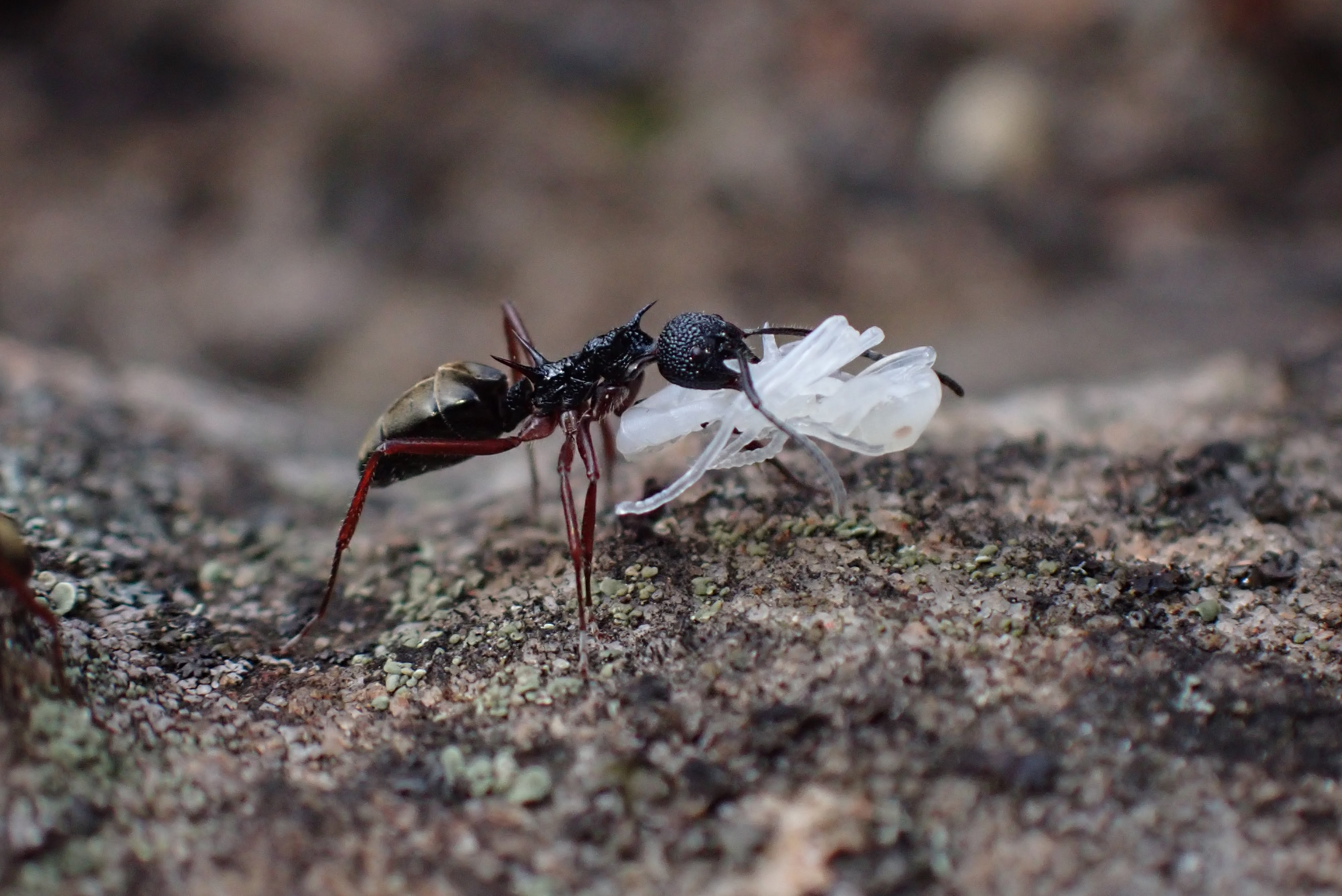 Chatting away we had reached where we’d be separating. At that moment I happened to notice a line of ants, what was unusual was that they were transporting the larva and pupa etc… I couldn’t remember seeing this before. I spent some time watching and photographing them. Even after we said our goodbyes (the others dropping down and Mum headed off along the ridgetops) I continued observing them. They seemed to be moving home or maybe they were ‘swarming’ like bees, and establishing a new colony… do ants do this? (I did a little reading and pasted some info I found online below).