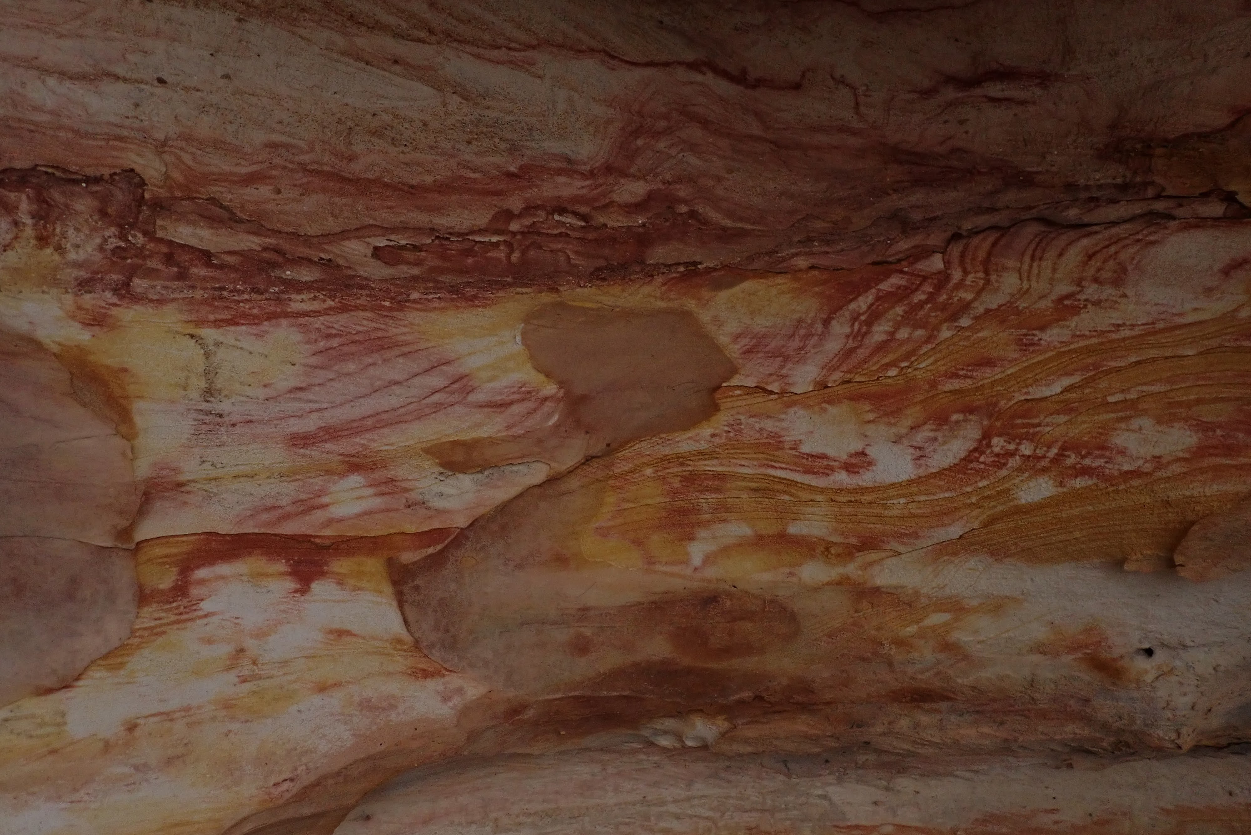 The walk along the ridge towards the cliffline where we were going to look for the aboriginal site was pretty and easy, quite similar to the ridge/spur we came up on yesterday. At a saddle, where we would later drop in, we dropped our packs and wandered with a lightened step on our mission to find the big overhang with the ‘surprise’ art site. By Felix’s former remarks I thought it was going to be a ‘short’ stroll. However, after wandering for may be 2 hours or more along and below lots of cliff lines, many of them interesting and pretty – but no sign of aboriginal art – we dropped down and finally were successful.
