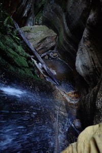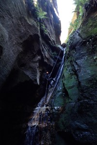 This was exciting: Was it possible to reverse this ck? If not we had to find another way up and probably run out of time. We needn’t have worried, after a surprisingly beautiful start with lush green mosses, narrow walls and lots of fun climbs. Soon we came to a steep part. For me unclimbable, but I was sure that Felix will get up – and he did. Before he got through the trouble trying to help me up he checked out the next part of the canyon. The verdict: Another climb, quite a bit harder than the last; but if we managed that one it looked like we would be making it out.. So we began the final stretch. Felix set up the rope for me and put loops in, so I had good hand-holds for the first climb. The second climb was tricky, hard and very slippery. Felix jammed a log in-between the canyon walls. Maybe it would help. I held it in place at the bottom, but in the end it wasn’t used. Once Felix made it, I had the easy task of climbing up ‘my’ personal ‘rope ladder’ (or etrier).