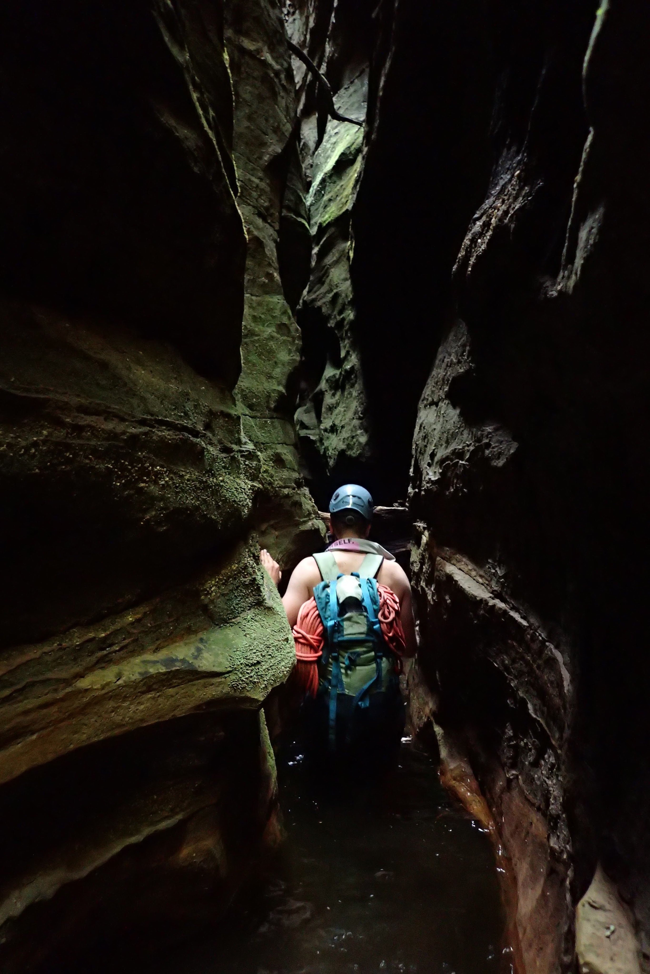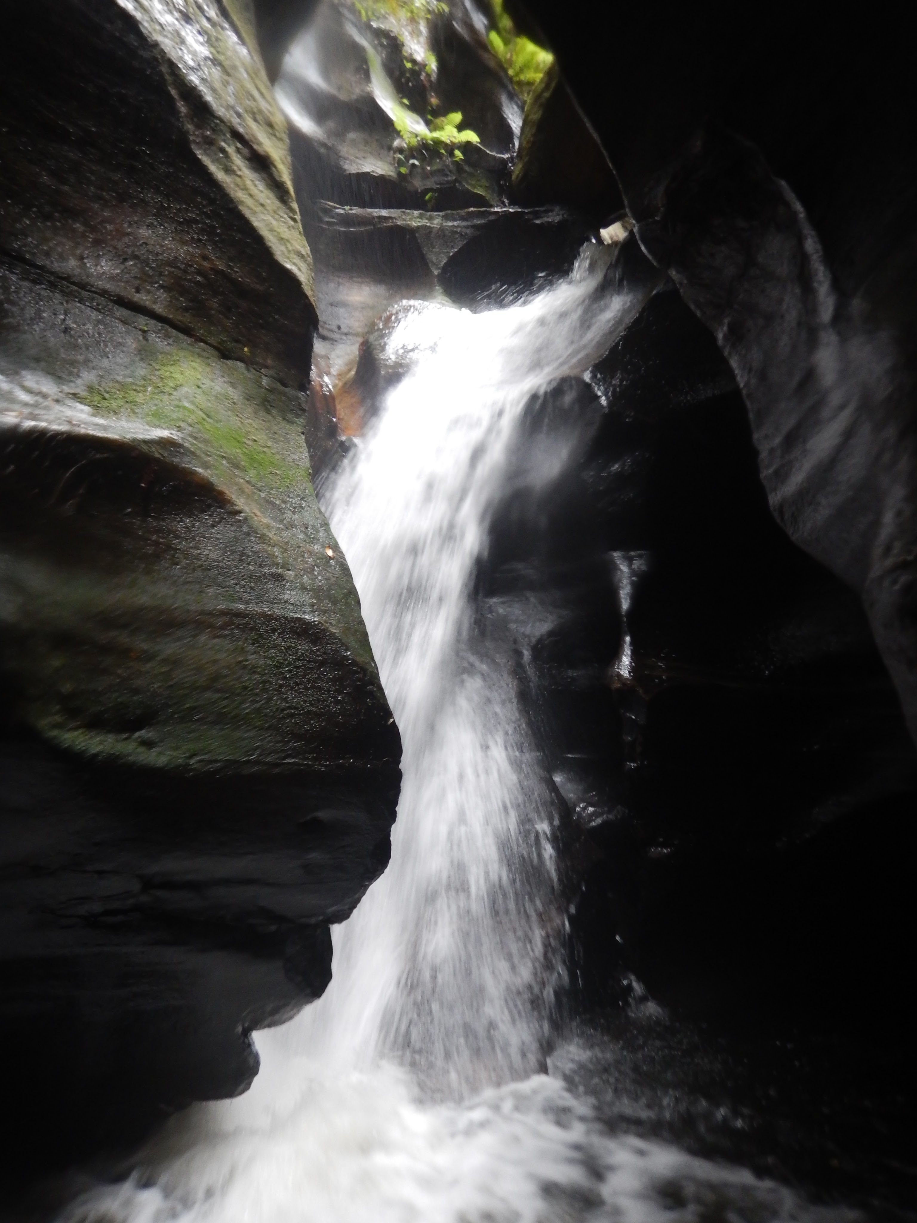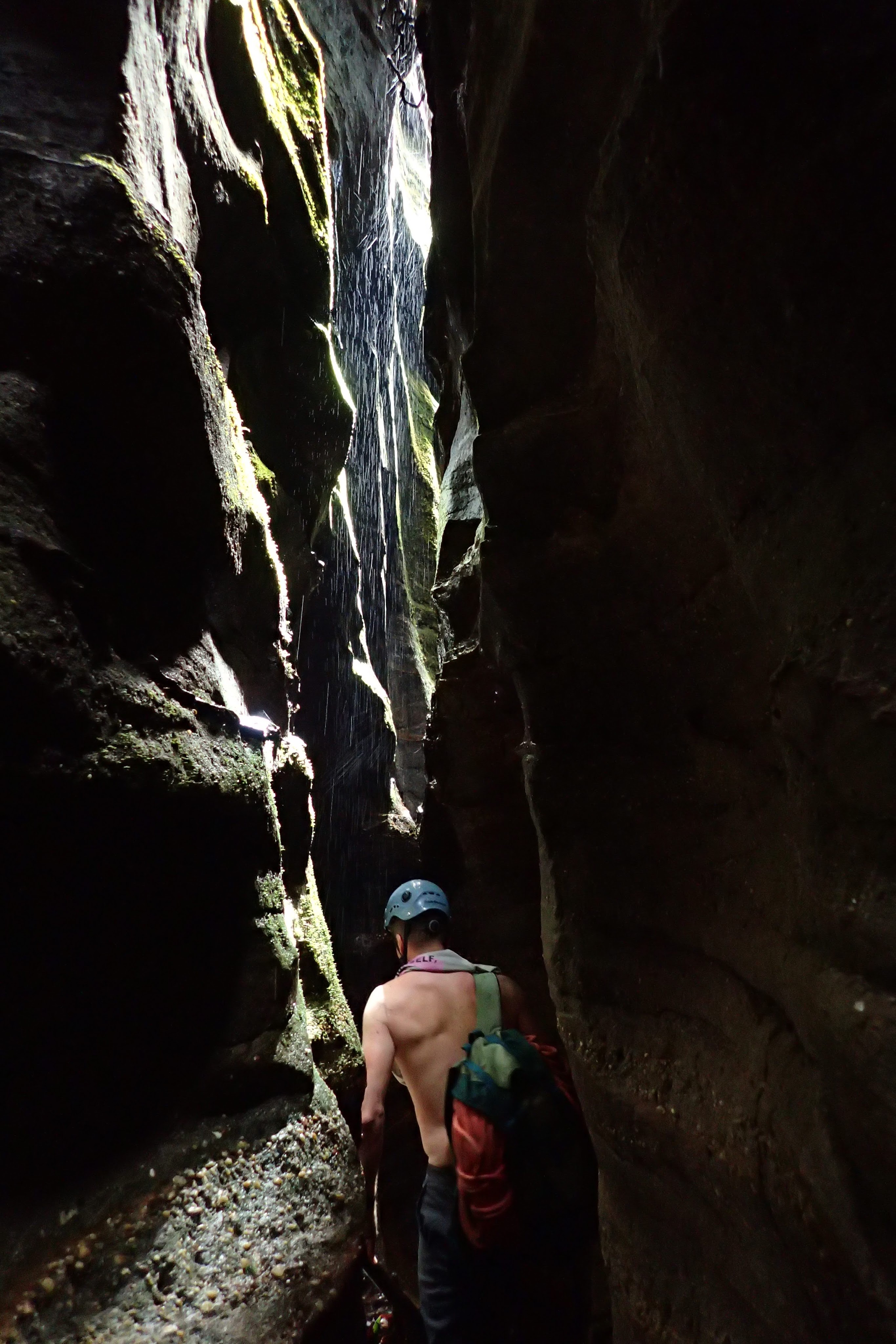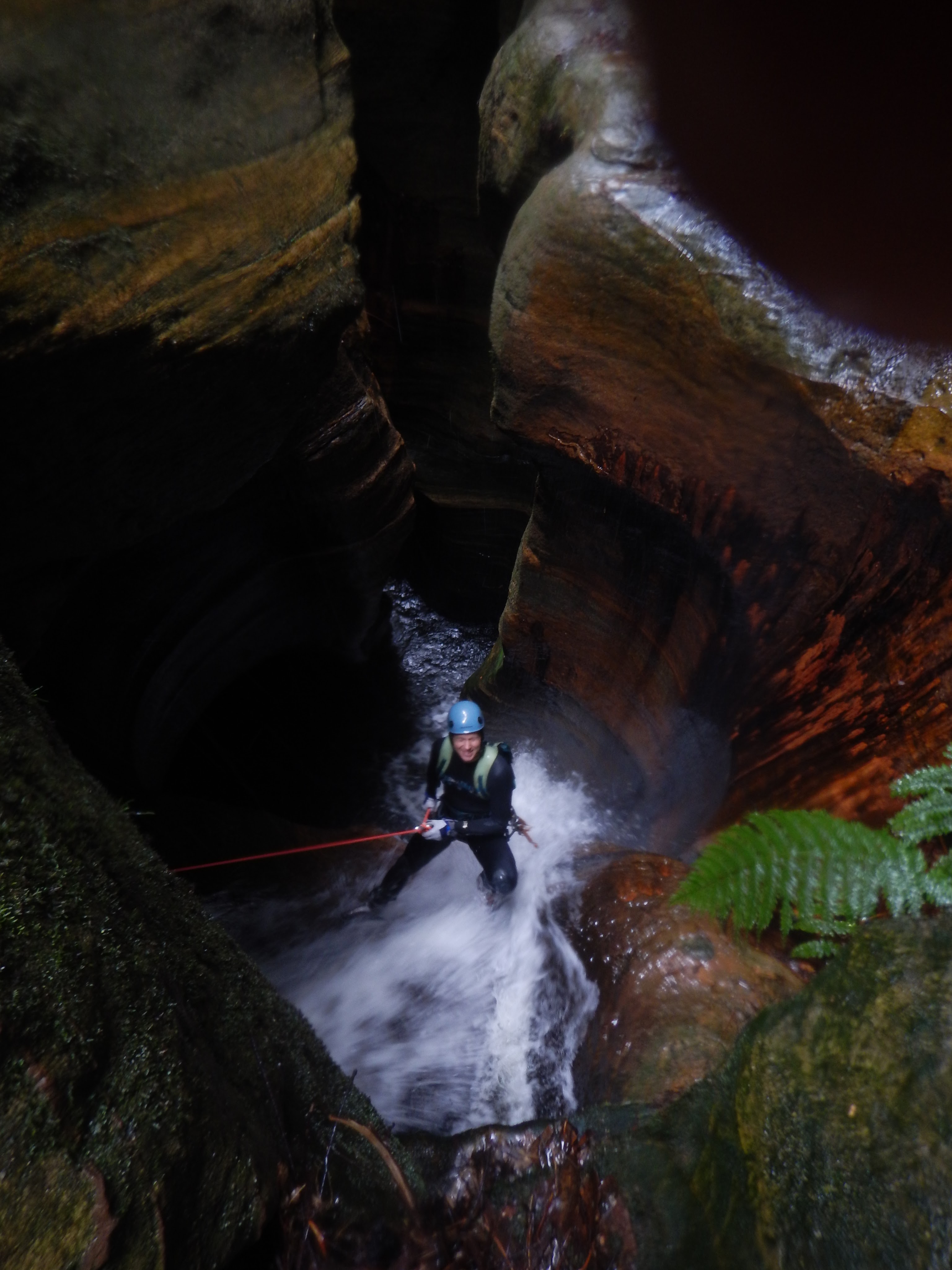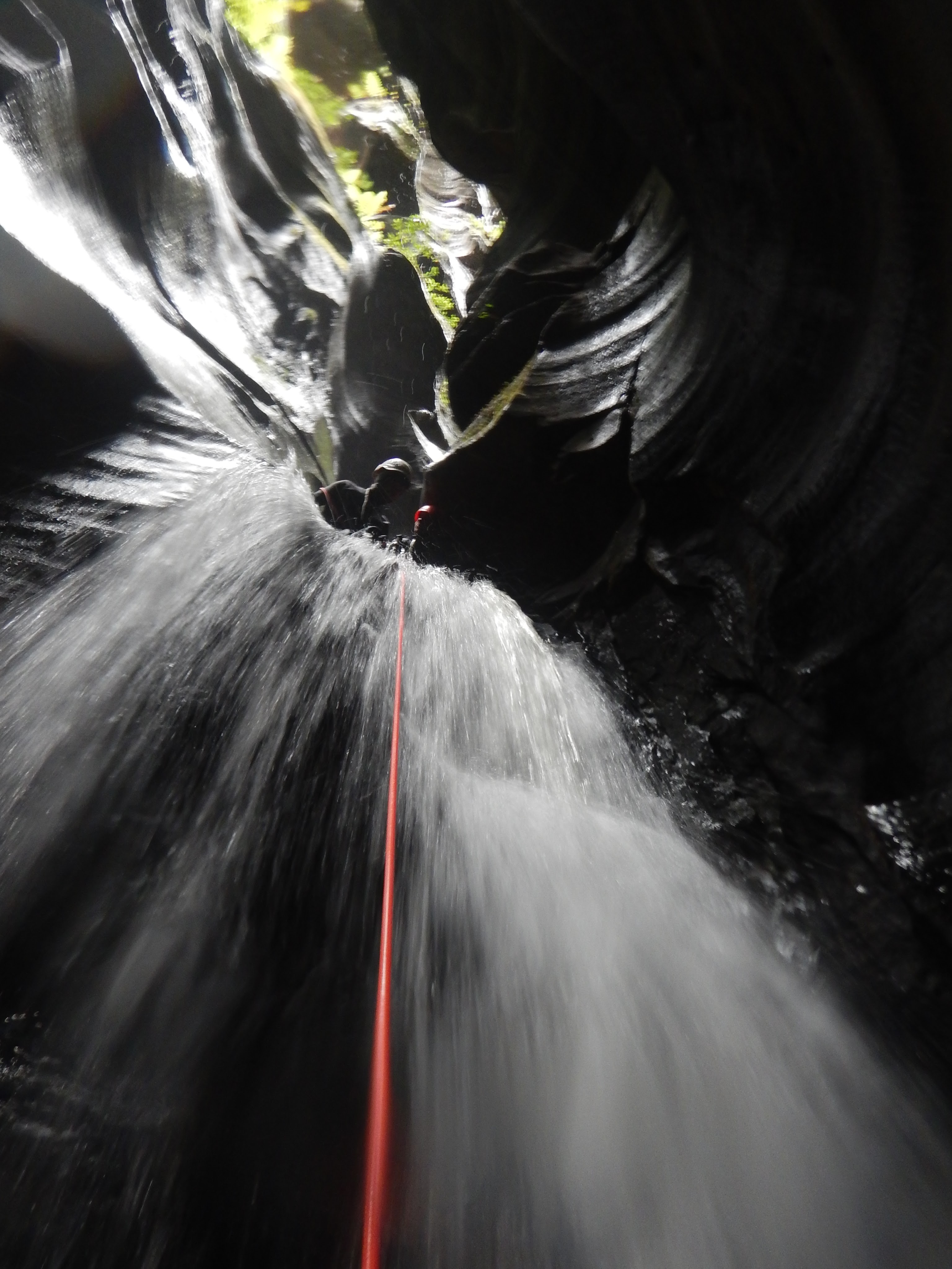 I went first down the next drop. A quick discussion about whether we should go down through the hole in the waterfall or over the chockstone resulted us going over the top. A speccy free hanging pitch.