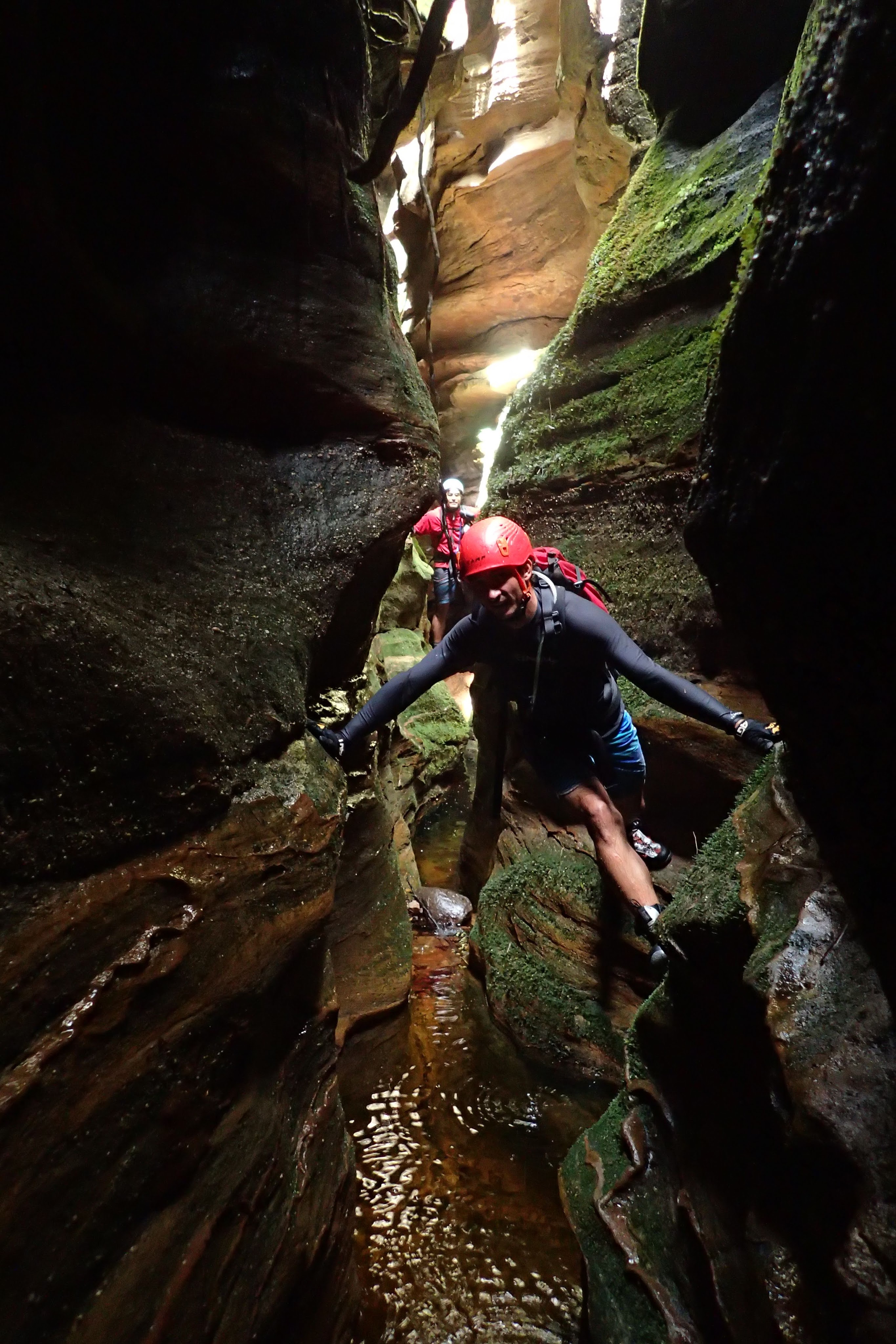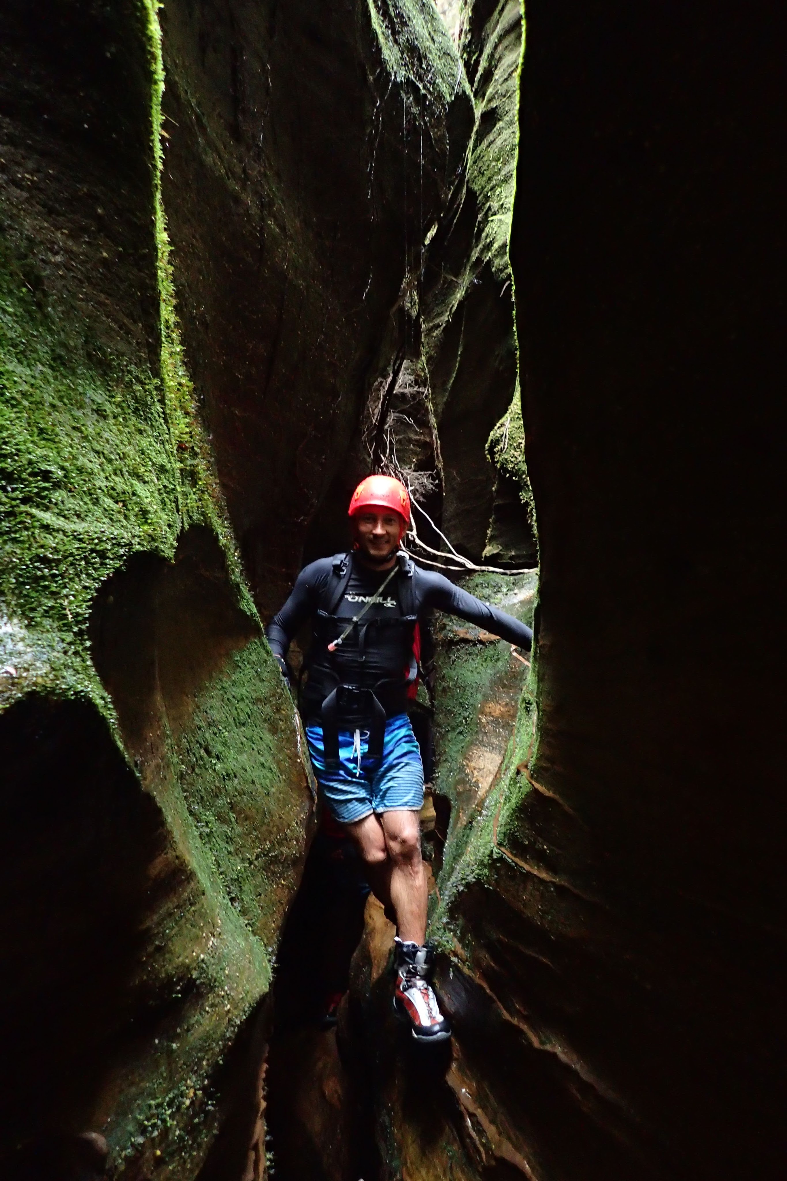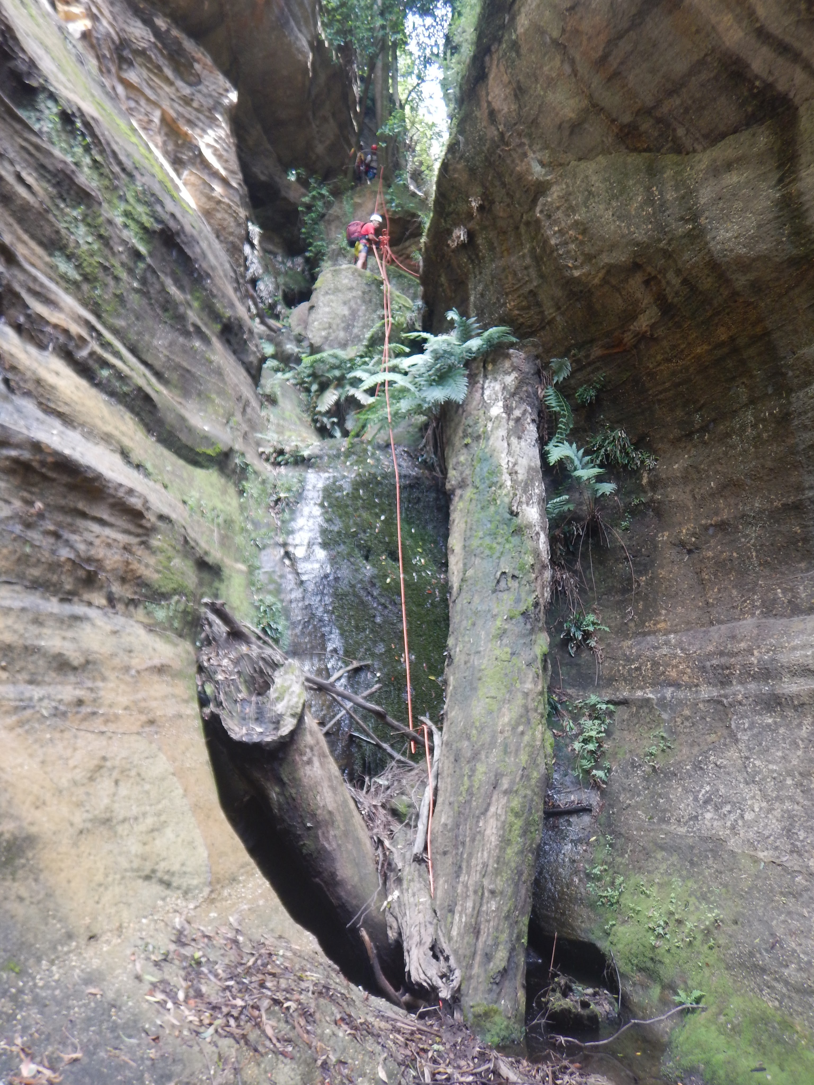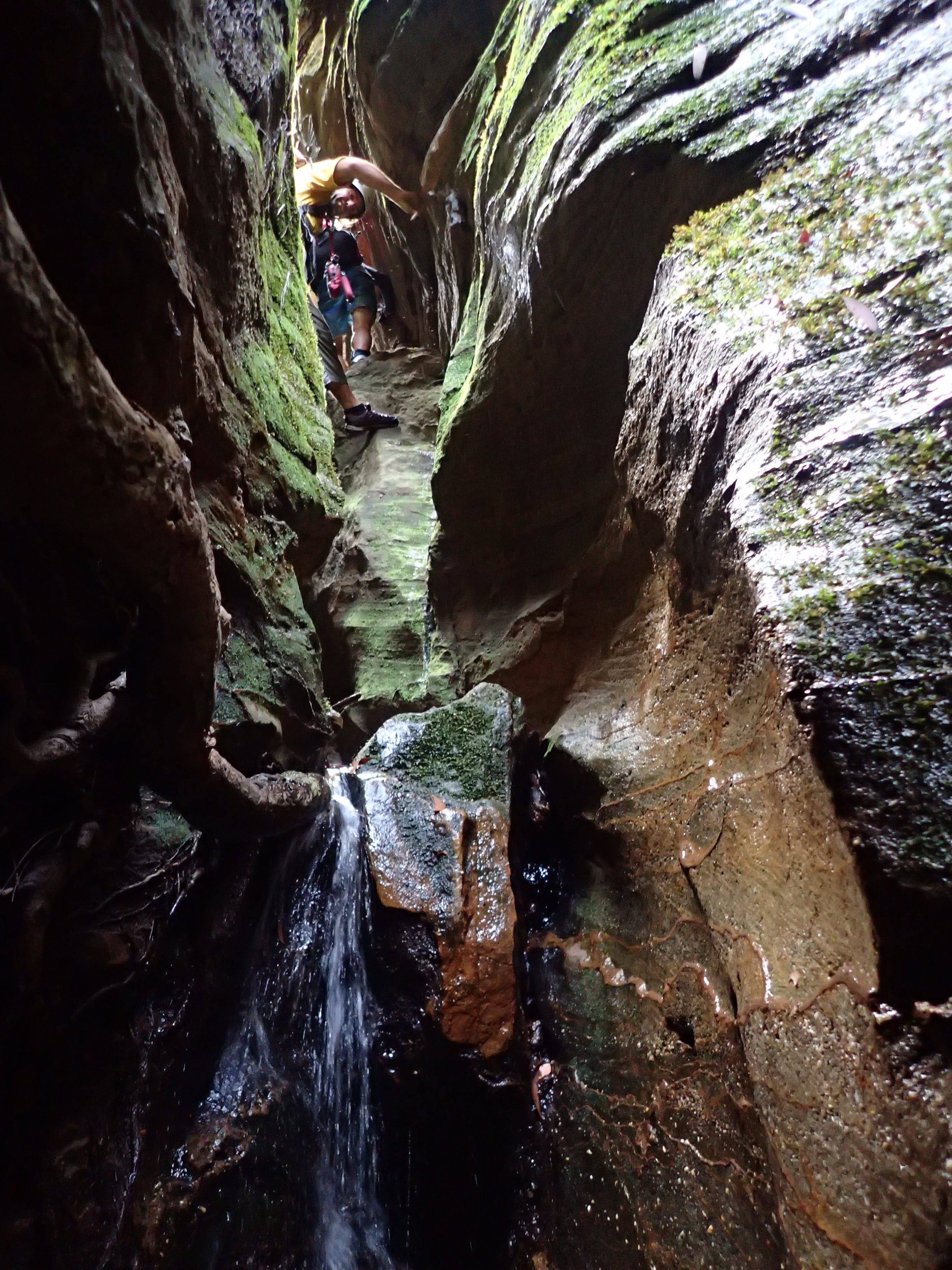 The water wasn’t particularly deep. Some of us took off our shirts for some of the initial deeper pool, but soon put them back on. The canyon was quite sustained, narrow and spectacular. The main two obstacles were two climbs. Both up tree roots. The lower had some Telstra cord which didn’t really make it any easier. I just used the roots.