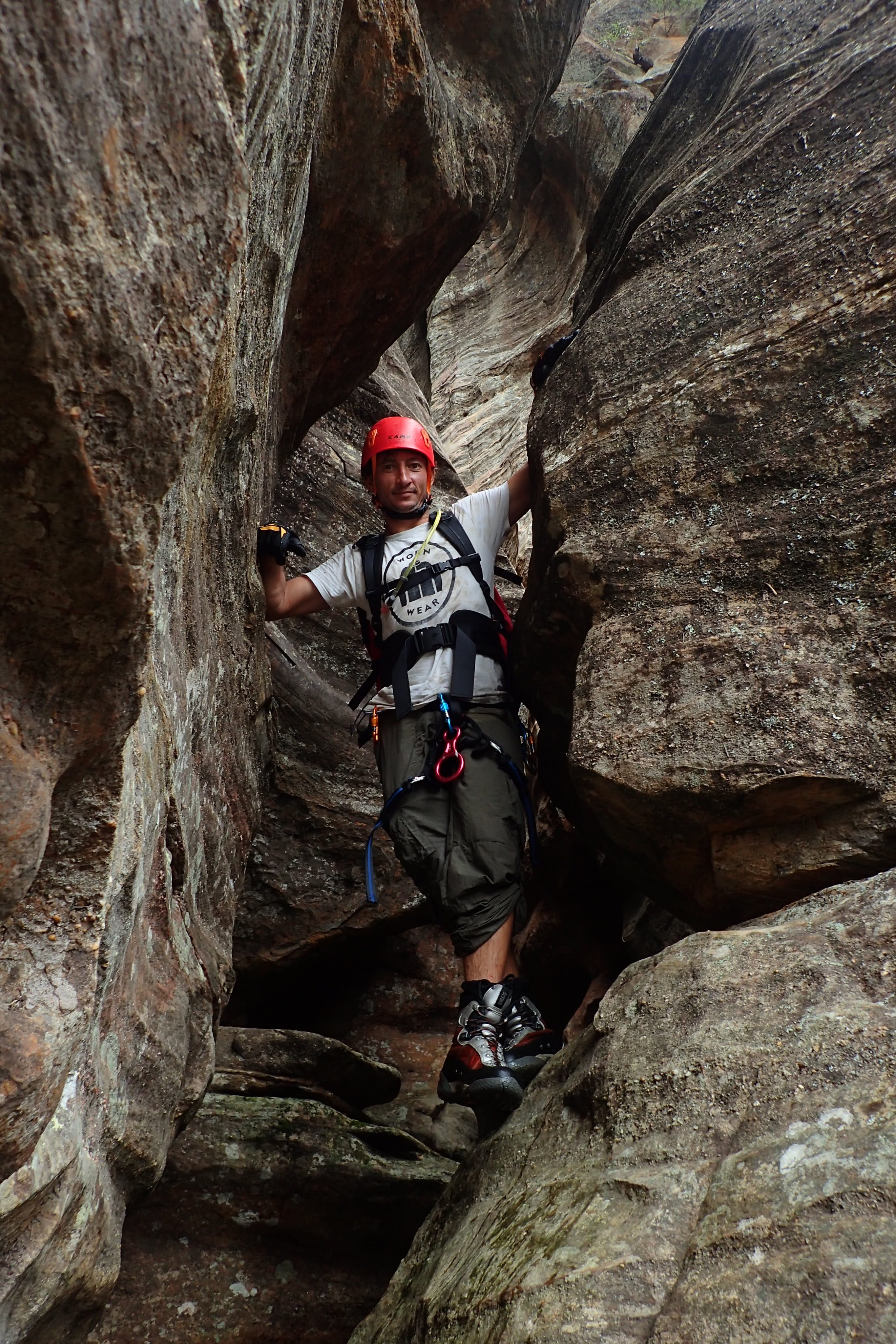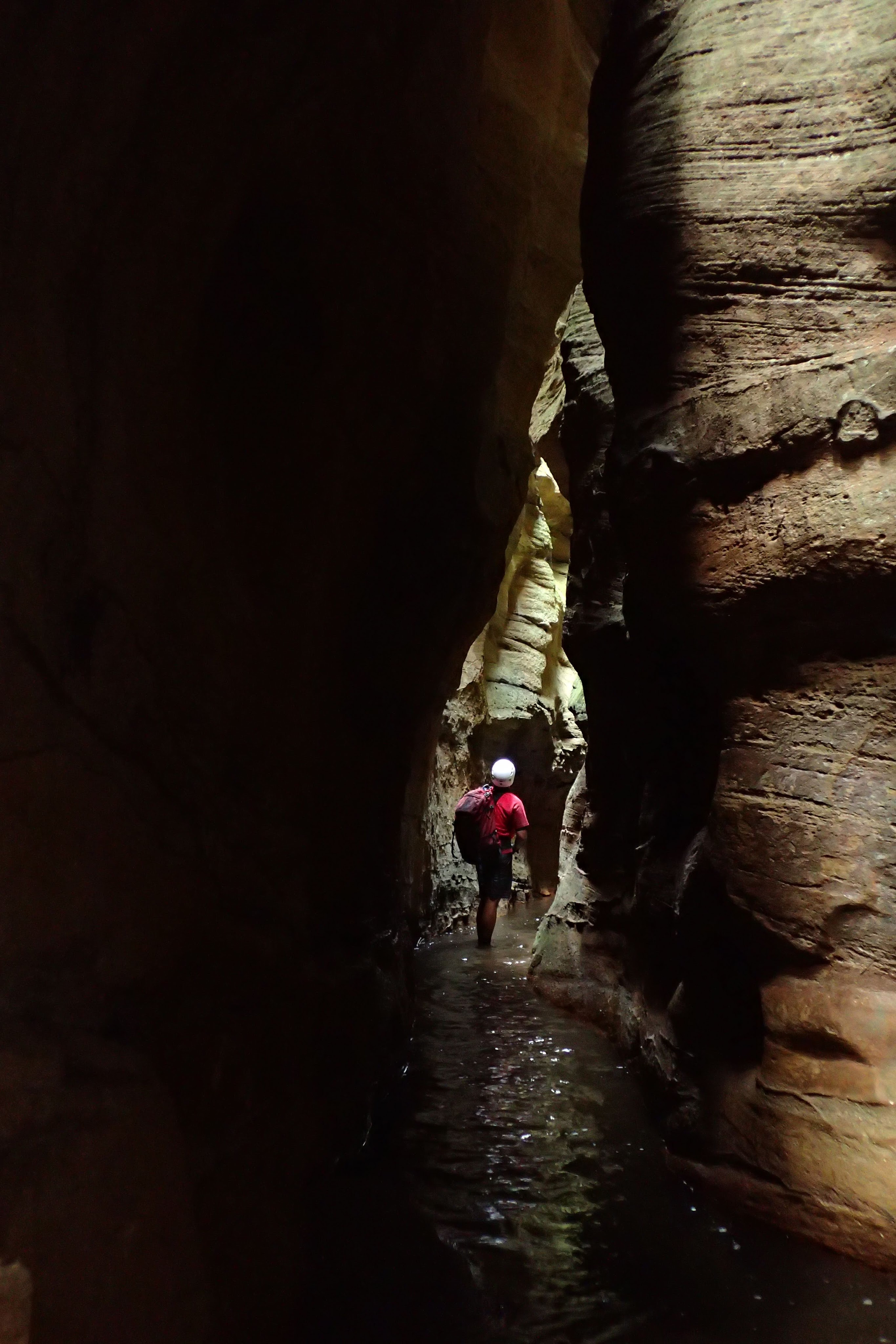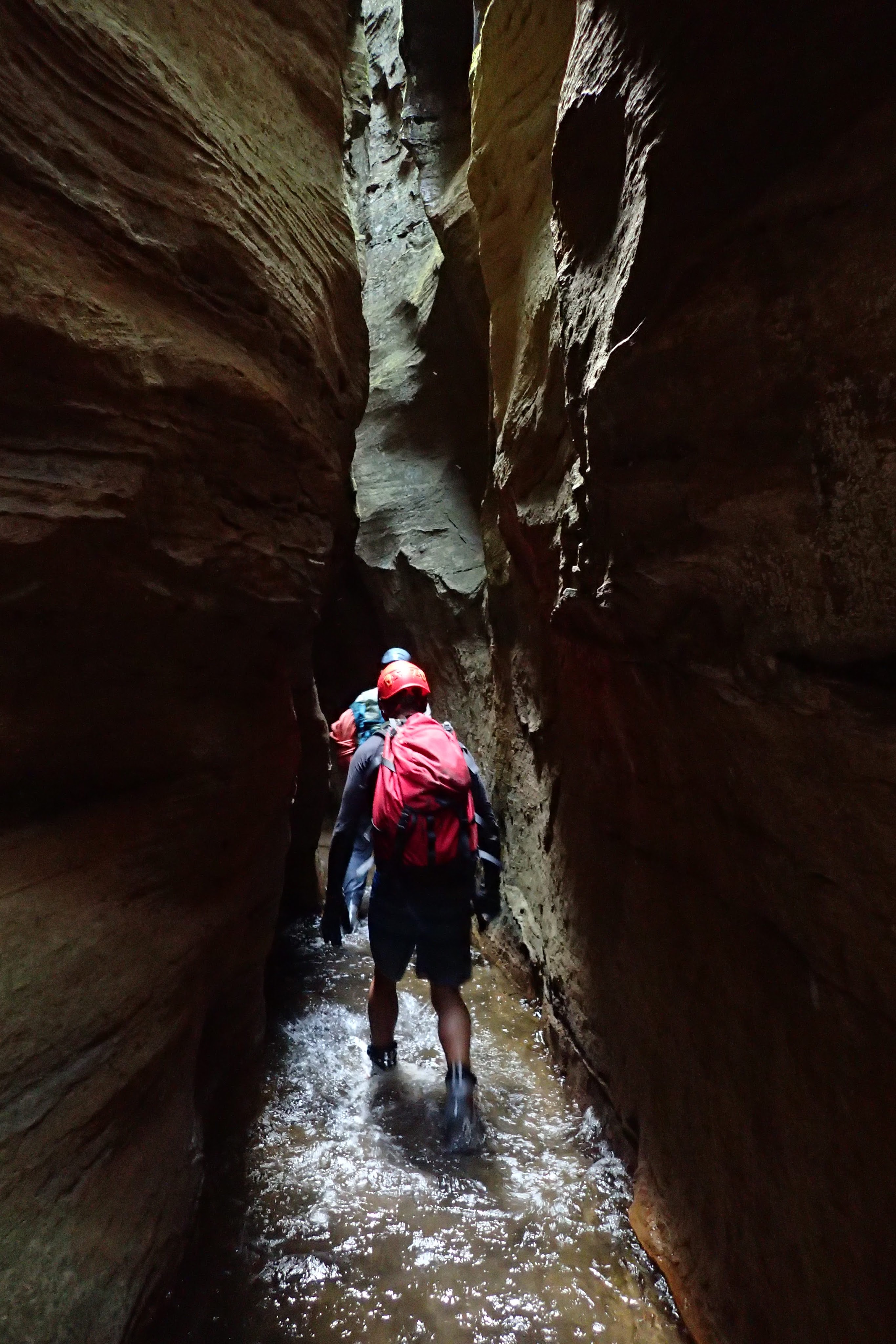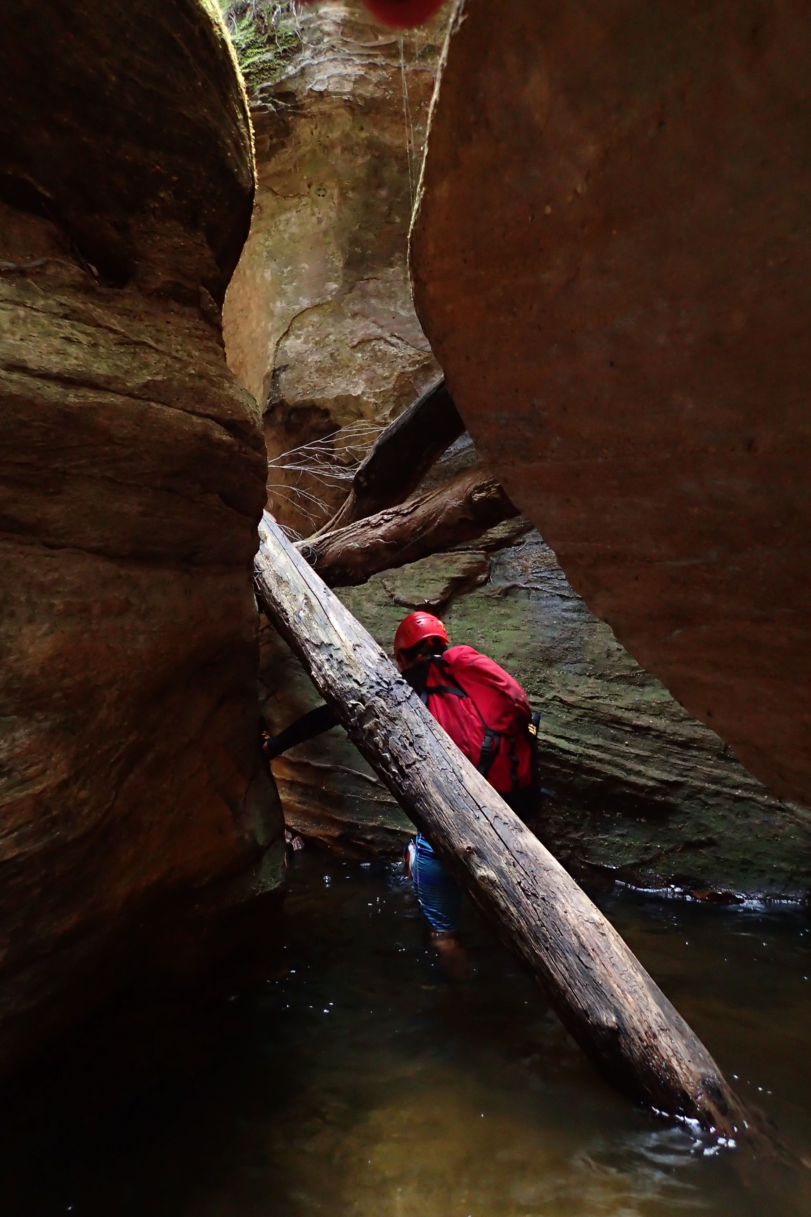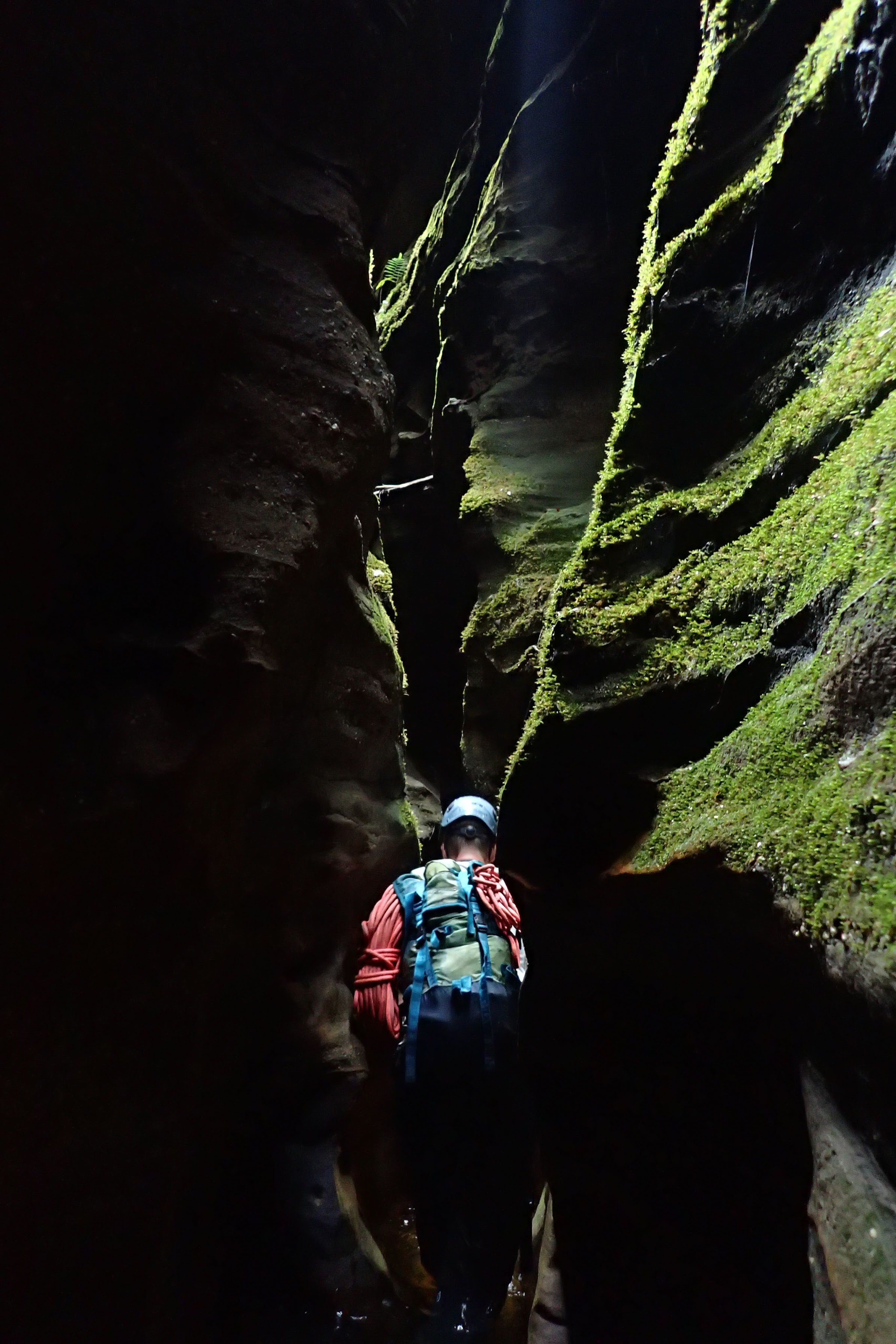 The water wasn’t particularly deep. Some of us took off our shirts for some of the initial deeper pool, but soon put them back on. The canyon was quite sustained, narrow and spectacular. The main two obstacles were two climbs. Both up tree roots. The lower had some Telstra cord which didn’t really make it any easier. I just used the roots.