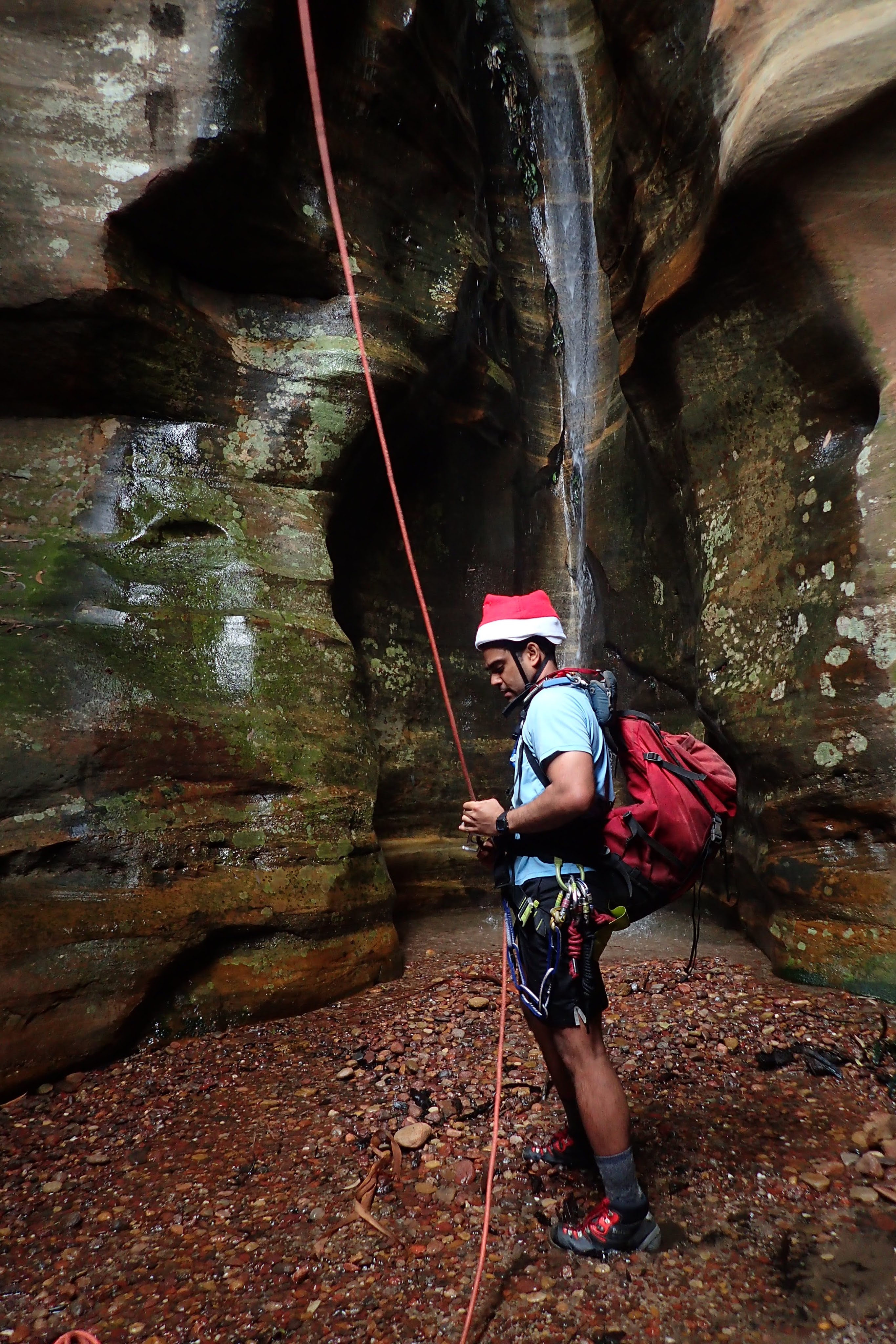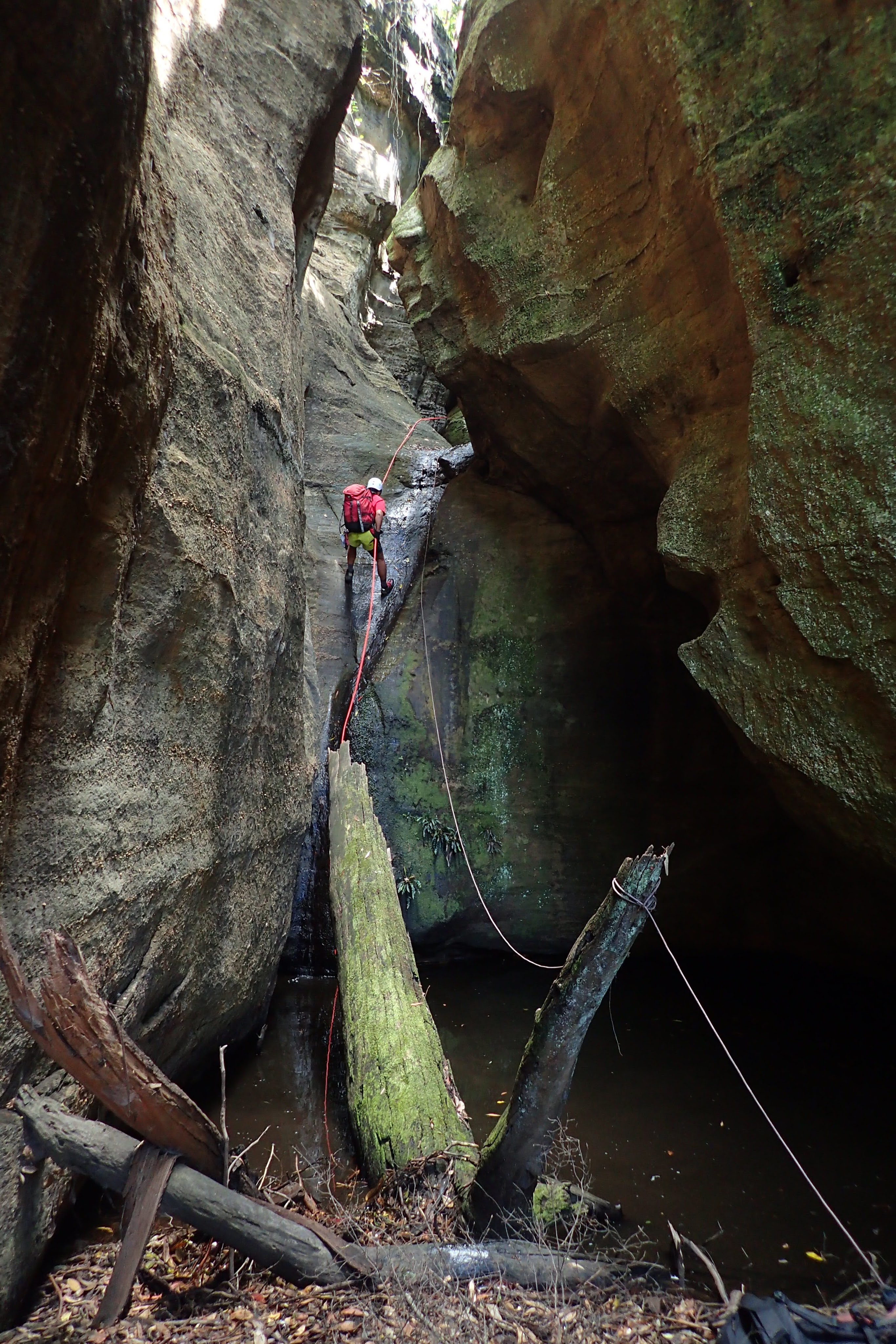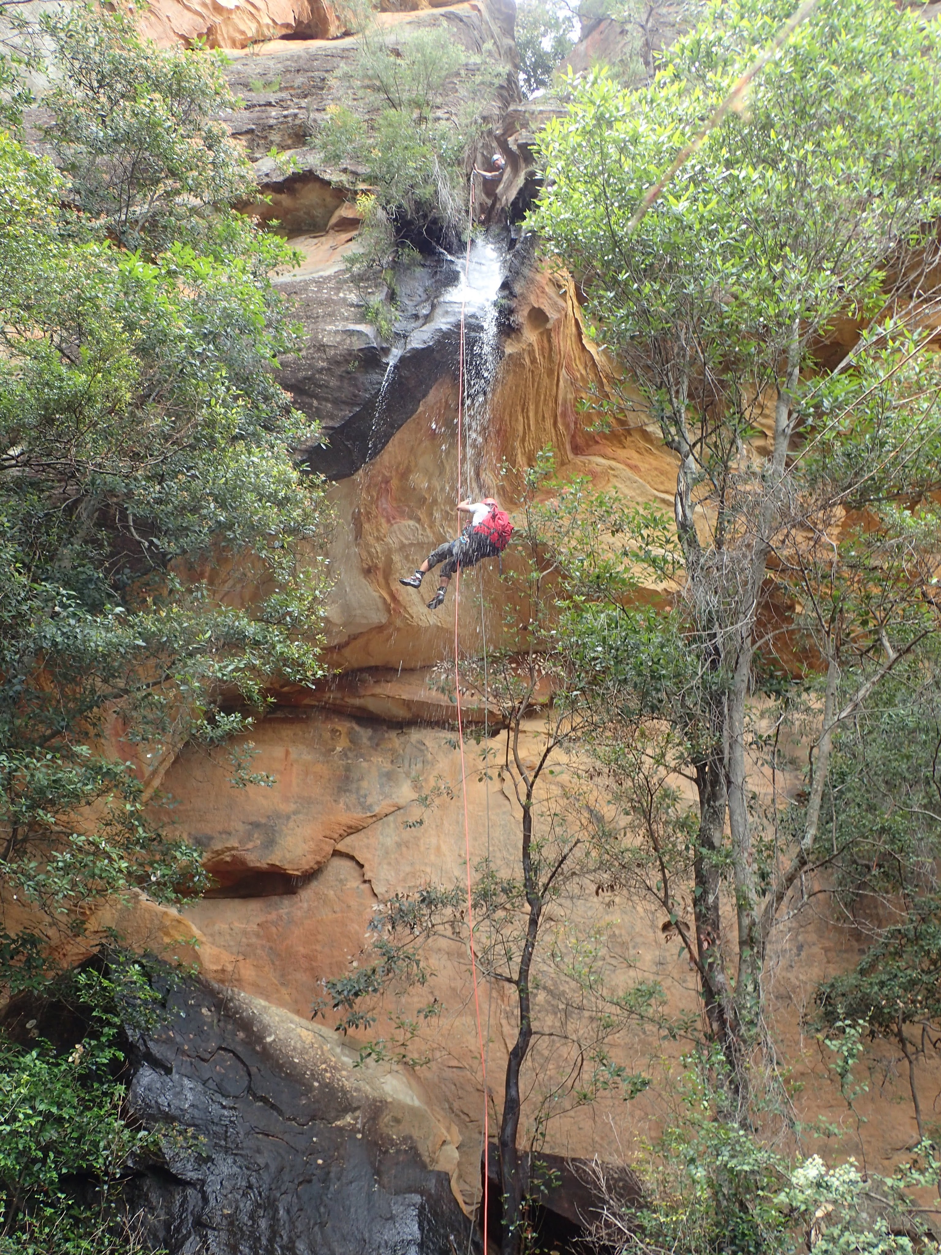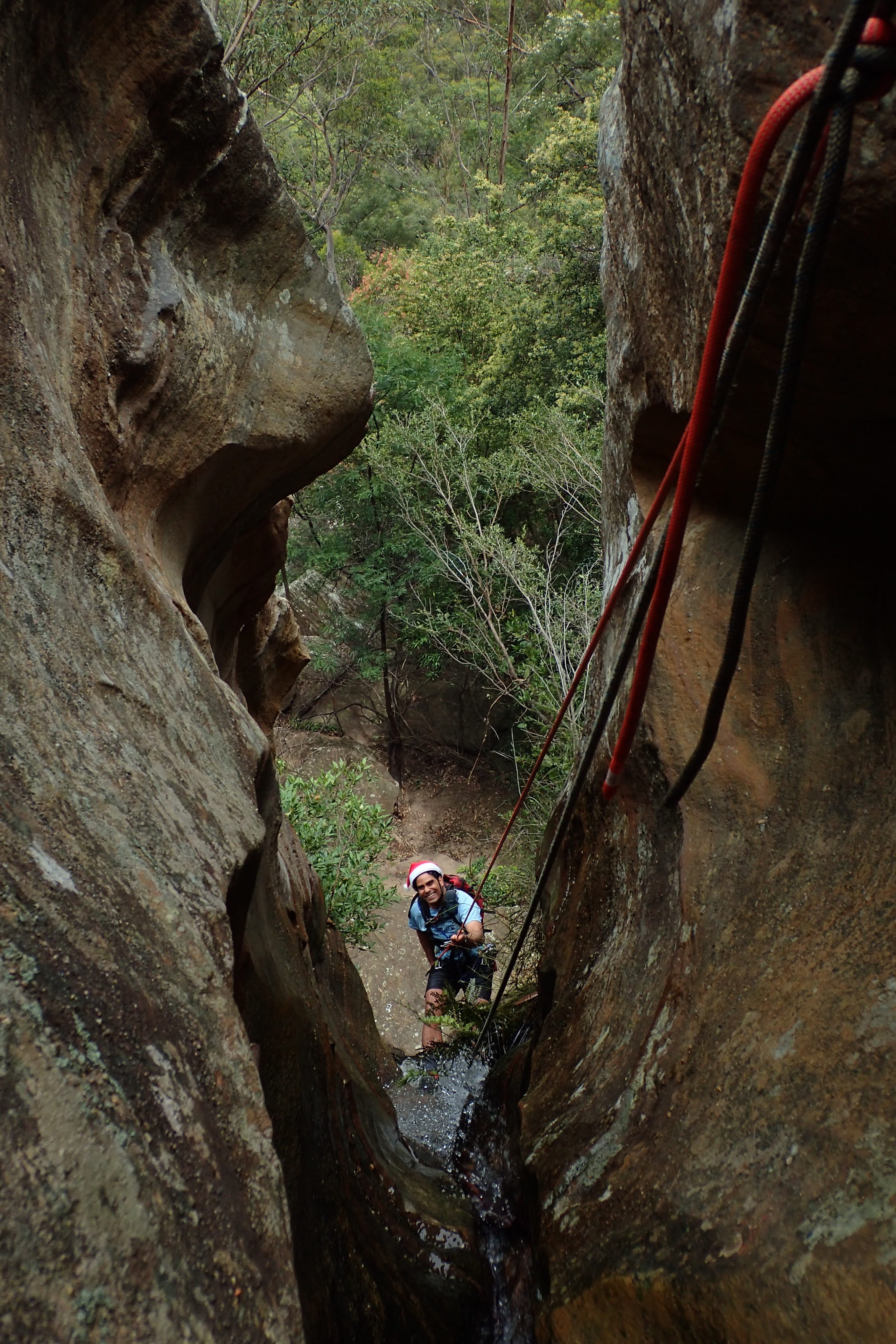 Once in the Wollemi we dropped down into our first ck. None of us had visited it before. Quickly we encountered our first drop. We built an anchor by threading a large rock sitting against the canyon wall. The canyon then opened up, it would have been simple enough to walk around had we known and wanted to. Some tape was wrapped around a tree at the top of the next multi-stage drop. Shitij led the way. At the bottom of the three drops he looked around for another anchor… nothing. We extended the rope attaching a pull cord to the other end.