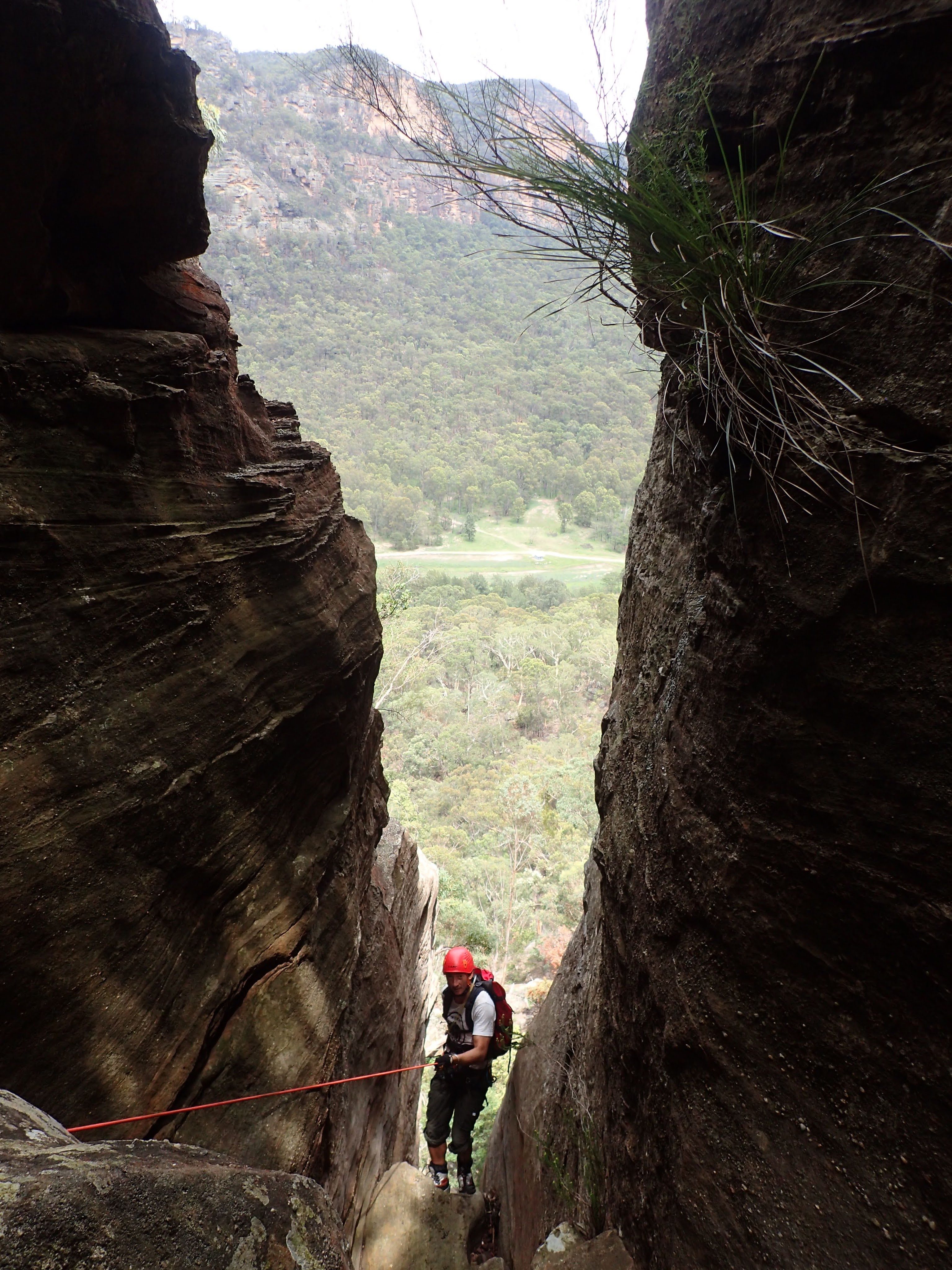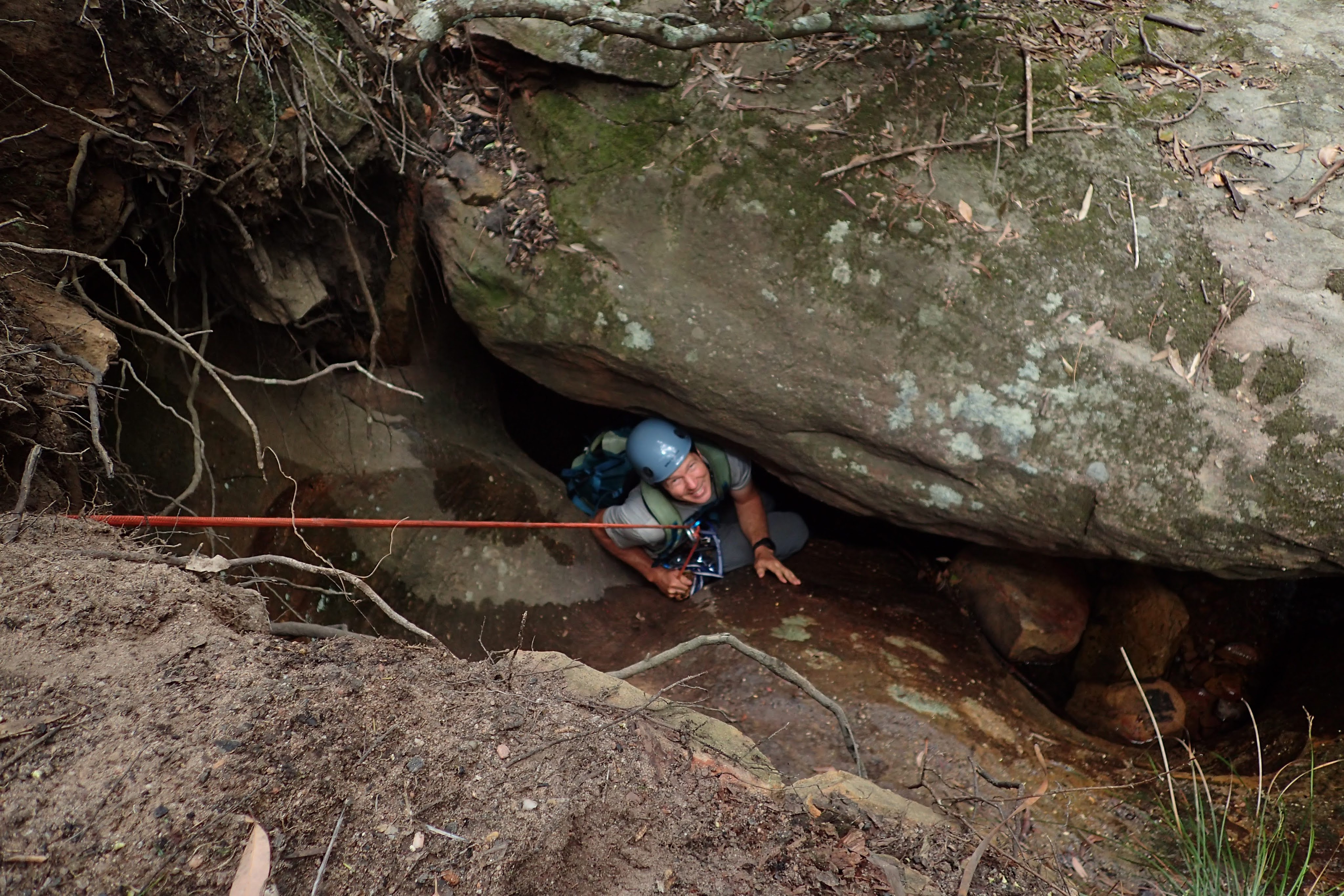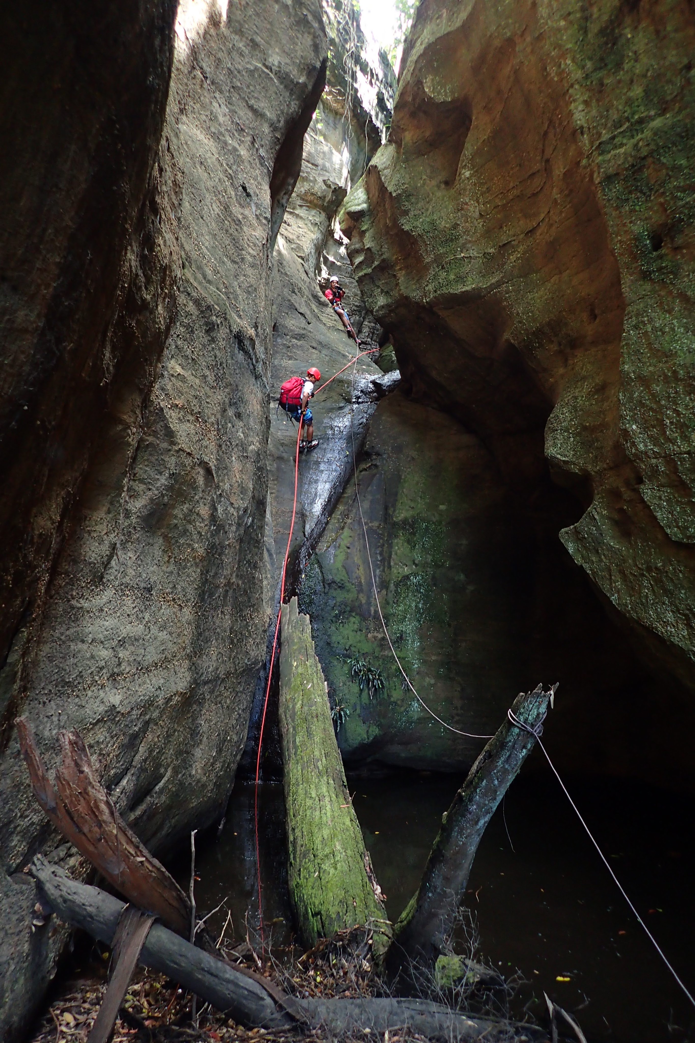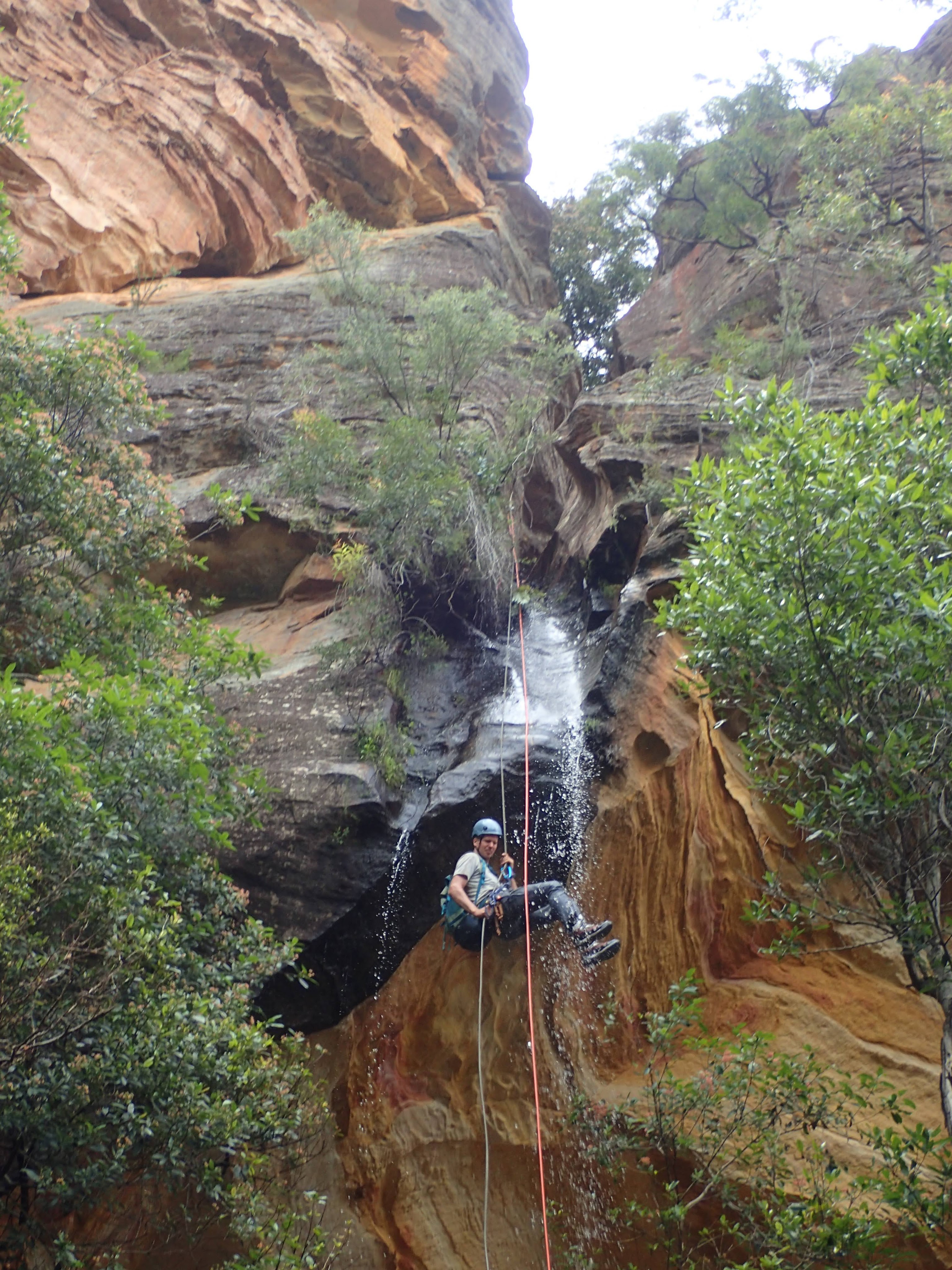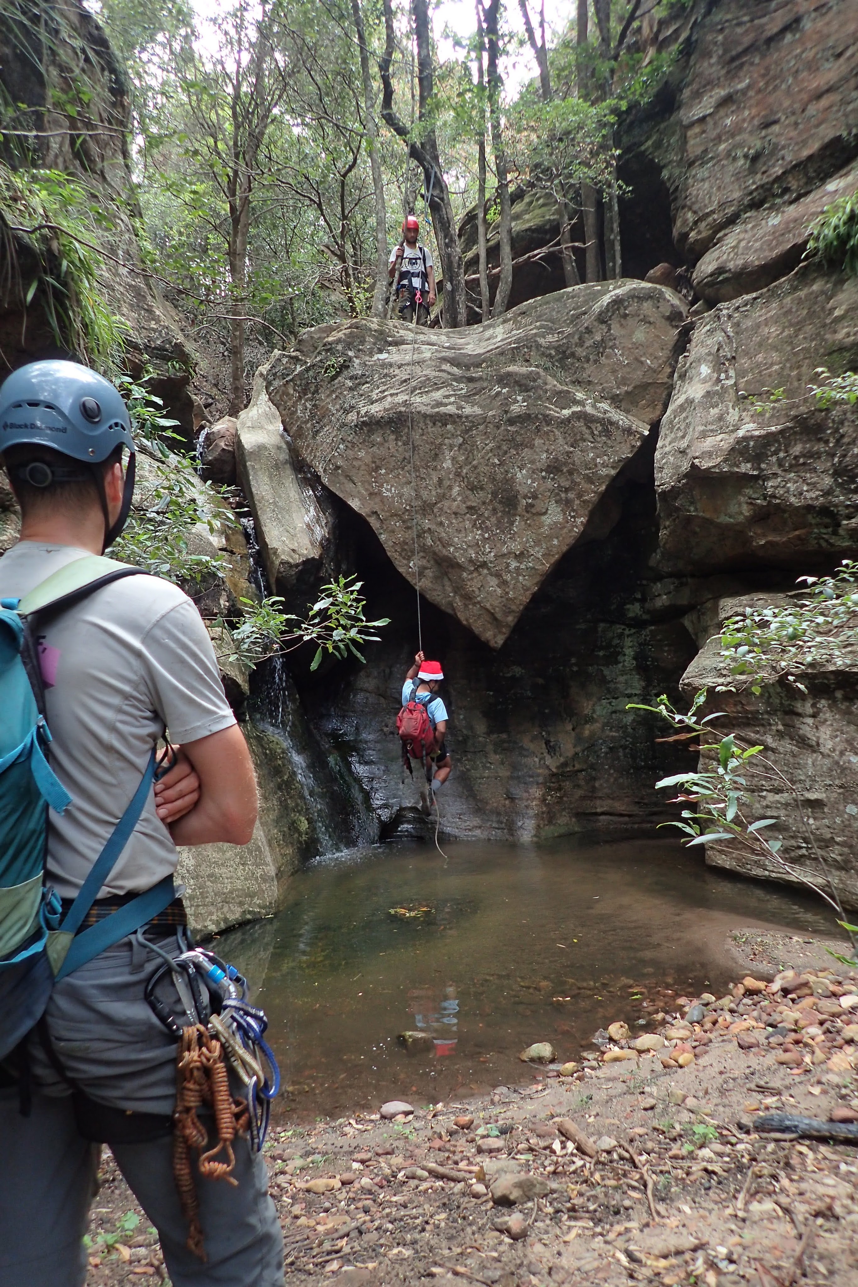 Once in the Wollemi we dropped down into our first ck. None of us had visited it before. Quickly we encountered our first drop. We built an anchor by threading a large rock sitting against the canyon wall. The canyon then opened up, it would have been simple enough to walk around had we known and wanted to. Some tape was wrapped around a tree at the top of the next multi-stage drop. Shitij led the way. At the bottom of the three drops he looked around for another anchor… nothing. We extended the rope attaching a pull cord to the other end.