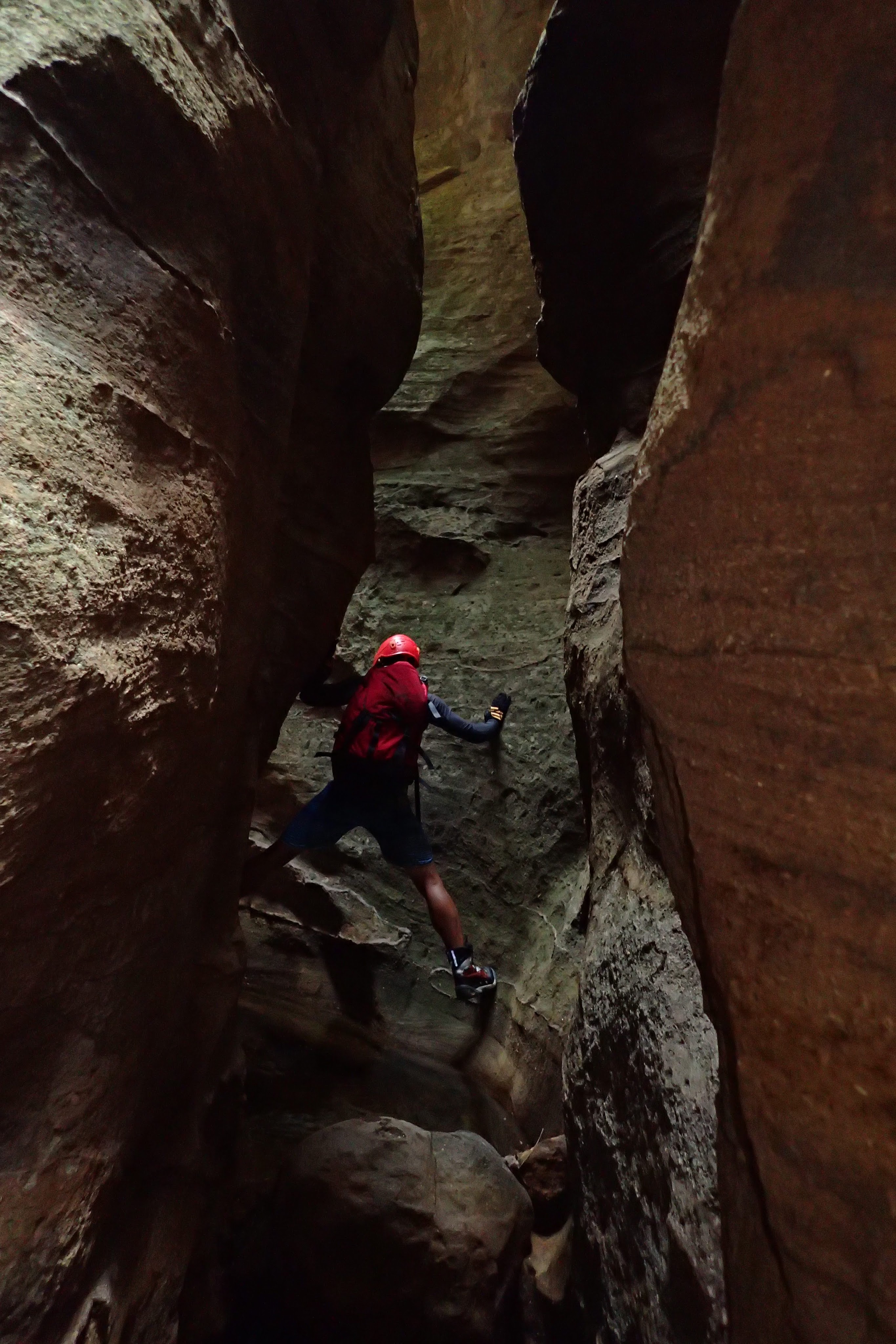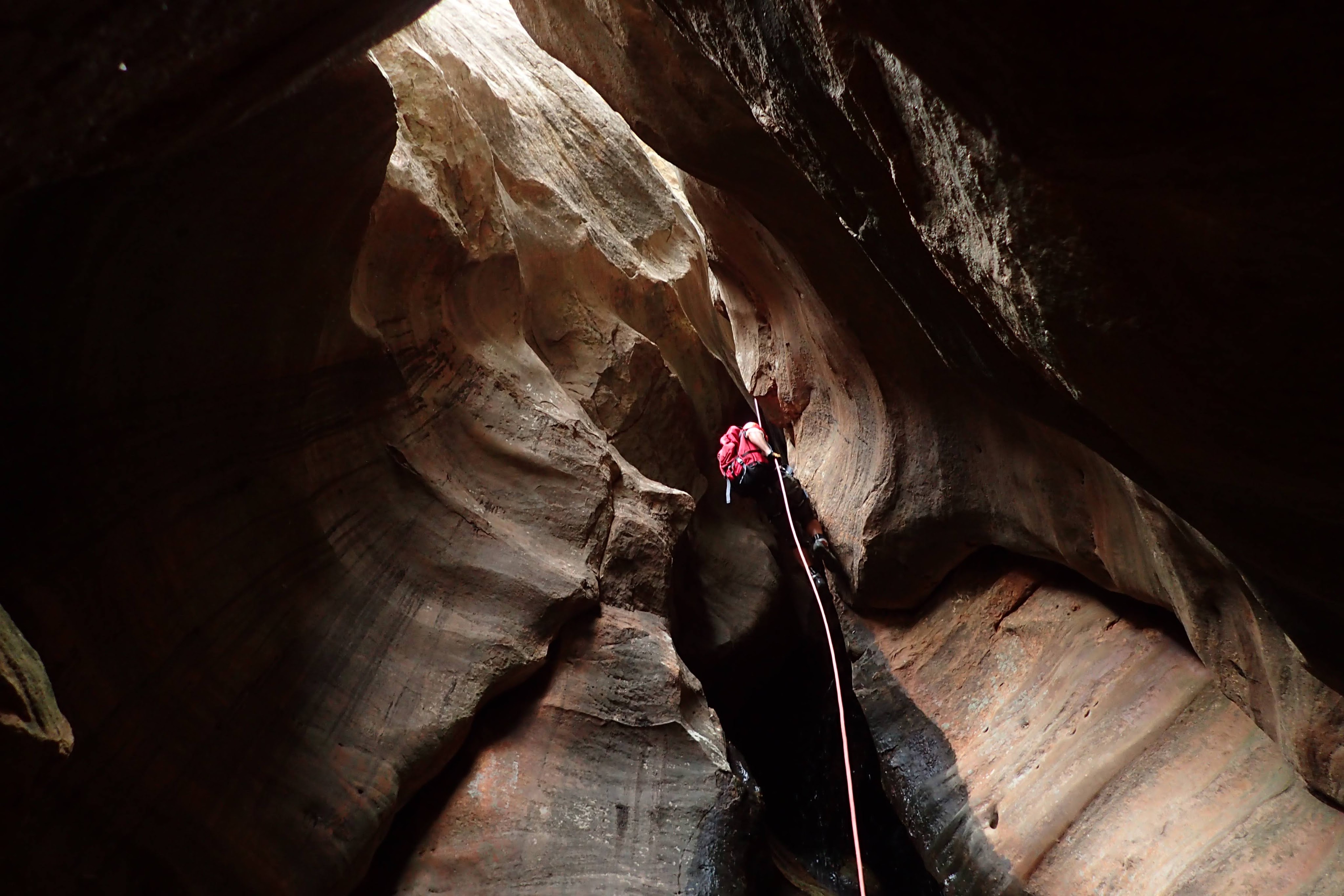 The pull proved challenging. Throwing the rope over a rock arch gave a better angle but the tail was getting jammed next to the chockstone. In the end we rigged a 3:1 from a second smaller natural bridge using a redirect to pull the rope away from the wall. Begrudgingly the rope came.