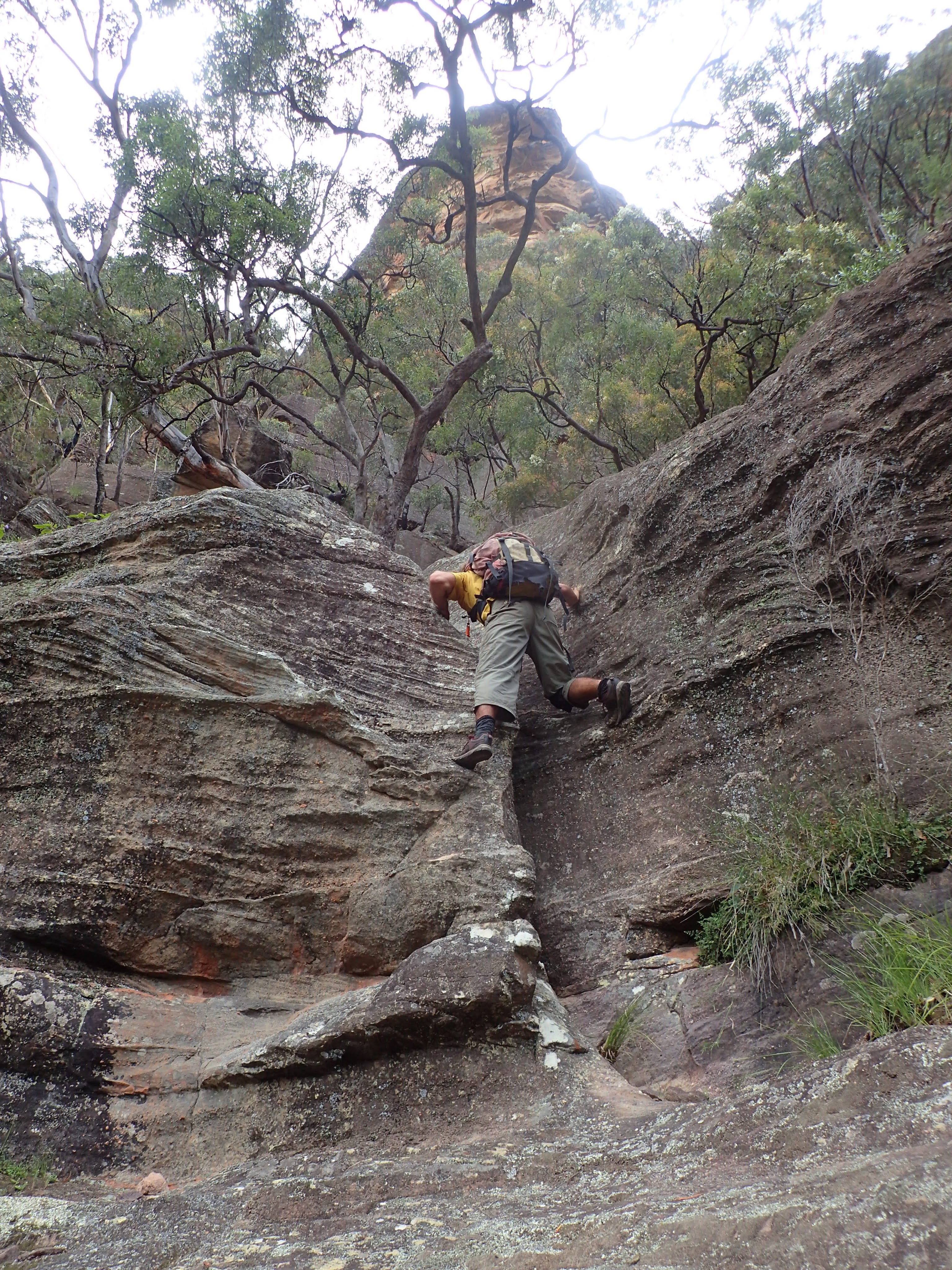 Returning we angered a tiger snake and were surprised to bump into a couple coming the other way. I was even more surprised when I recognised Narissa an old work college. Fishing a mustard belly snake out of the water we collected our packs and continued downstream. There were a couple of new bolts I couldn’t recall. I thought it had been a fixed hand-over-hand in the past (we didn’t bother putting our harnesses back on). We jumped another small drop. Passing the Rainbow waterfall we were soon at the exit. Up we went, traversing back around into Rainbow Ravine and up to the Camels Hump for afternoon tea on a nice rock platform used by aboriginals in the past.