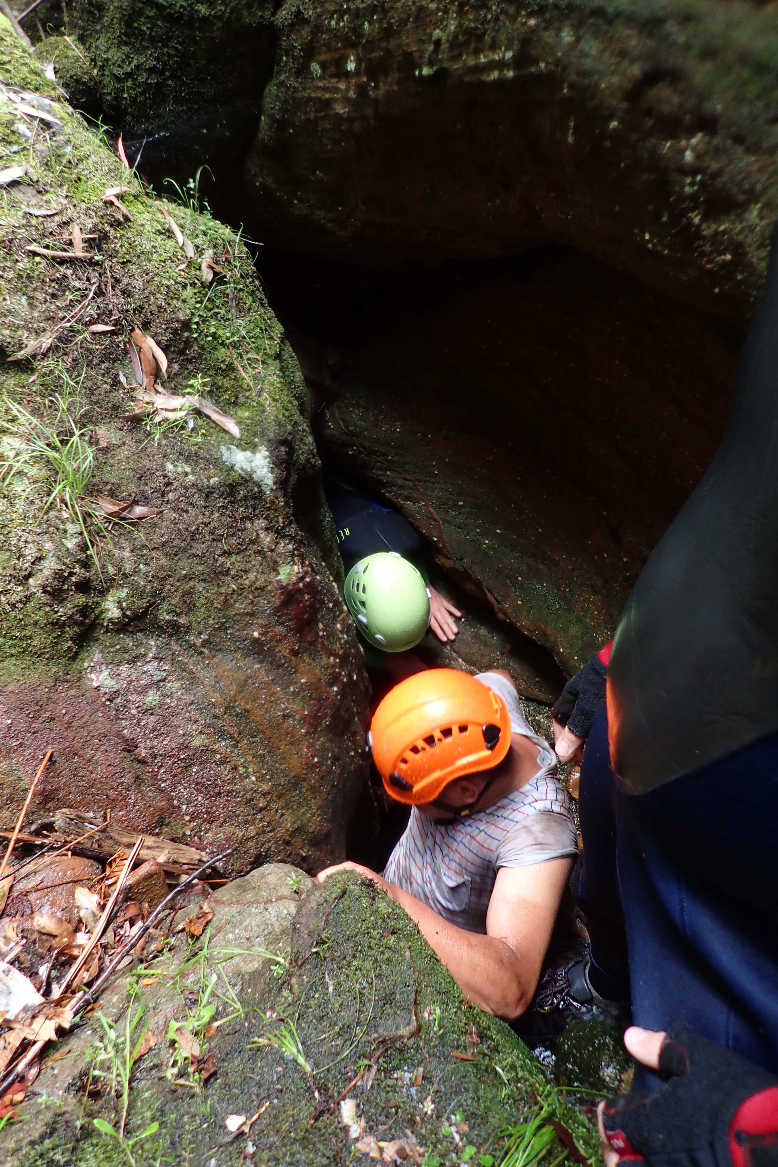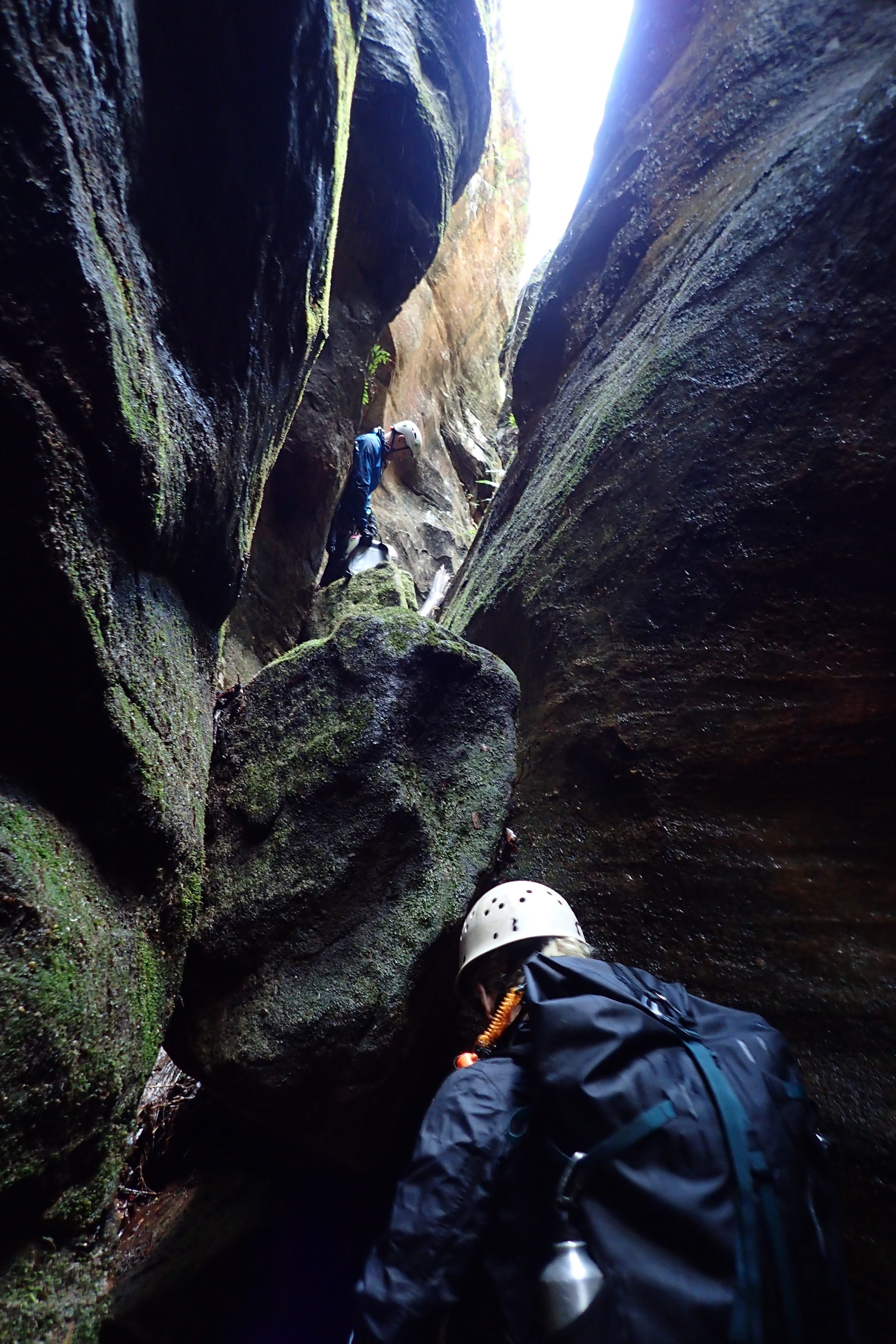 Where the canyon opened up (just before Upside Down), we stopped for lunch. I wasn’t super hungry so went to reconnoitre. After returning to leave my shirt behind I made it up and over a chock stone, wedged a tree branch into the canyon to aid me up the next climb, braved a neck deep pool and made it to the top of the next waterfall climb. It seemed like I was pretty much out so I returned to report. It seemed like the group was a little split. The option of staying dry by climbing out using some vines was tempting for many. Luckily Phil was of similar mind to me and in the end the decision was made to go up through the canyon. We pack-passed over the chock-stone (most ppl pushing through the hole below it) and up the next climb.