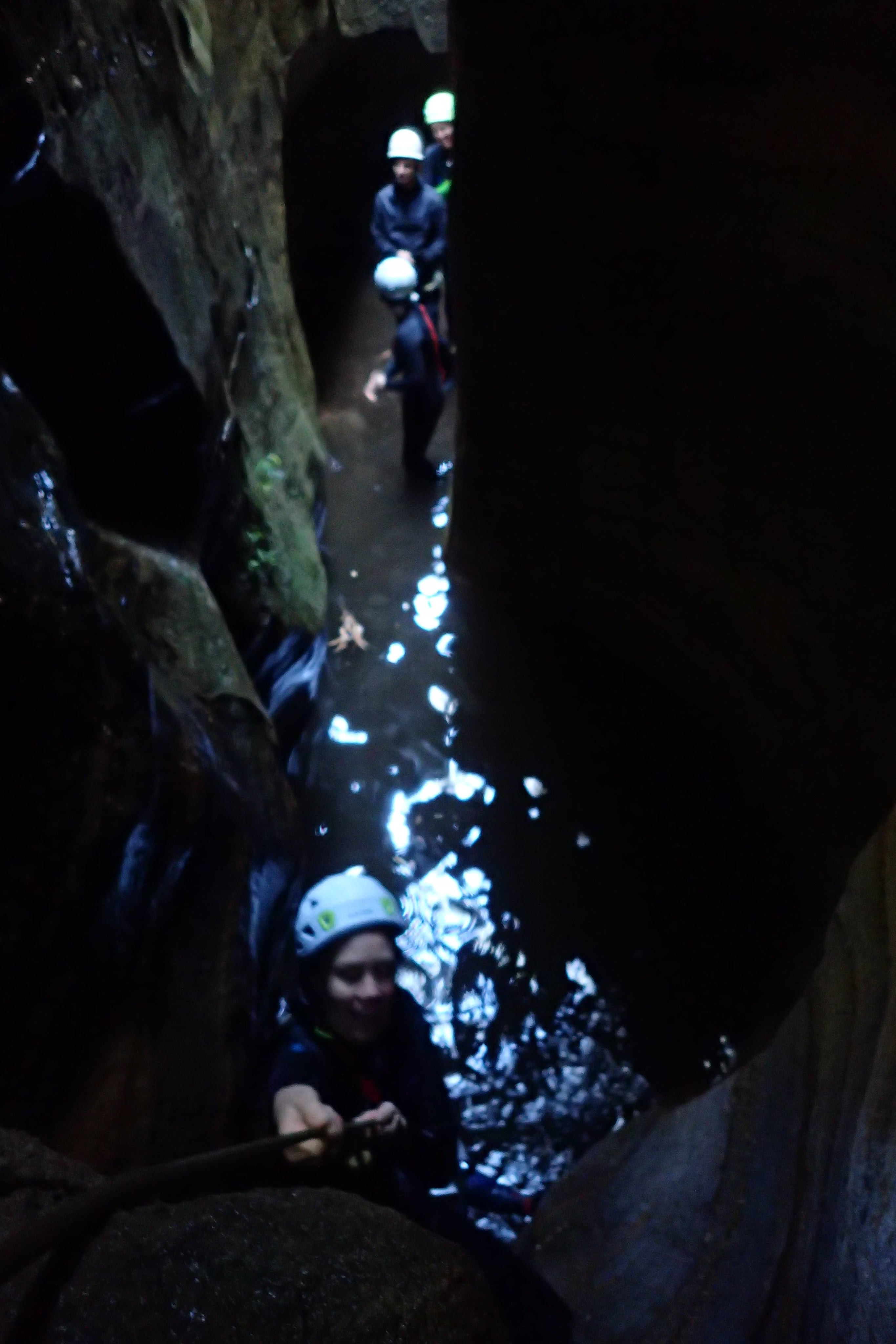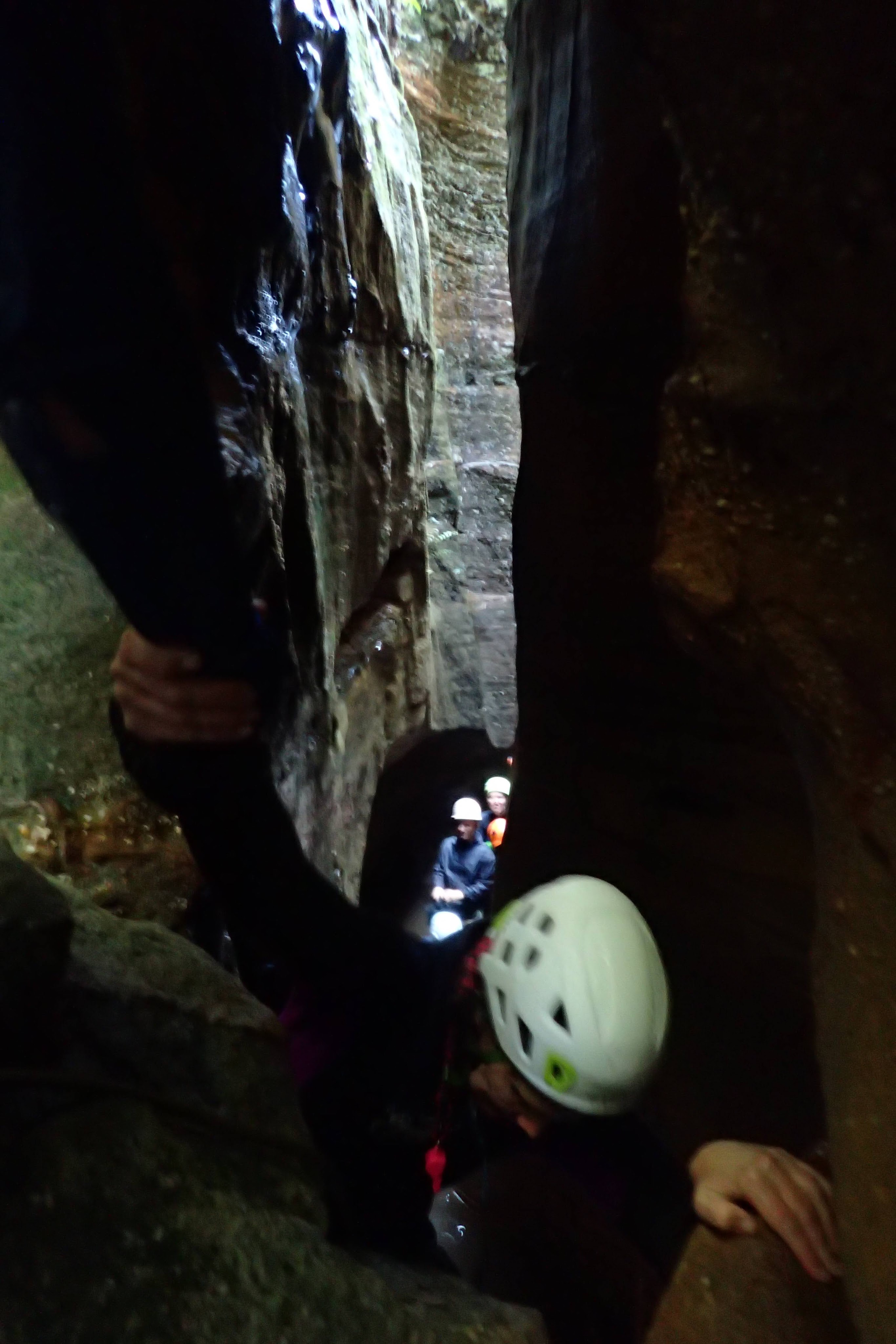 I found the climb up the waterfall easier then the previous, though there was some contention about this. I dropped down a handline and after hauling packs up I cut off an old piece of tape. The pool here also drained a little but almost everyone got wet crawling under a boulder and up through a hole. Sabrina and Kirstie however managed to squeeze through a hole high on the side.