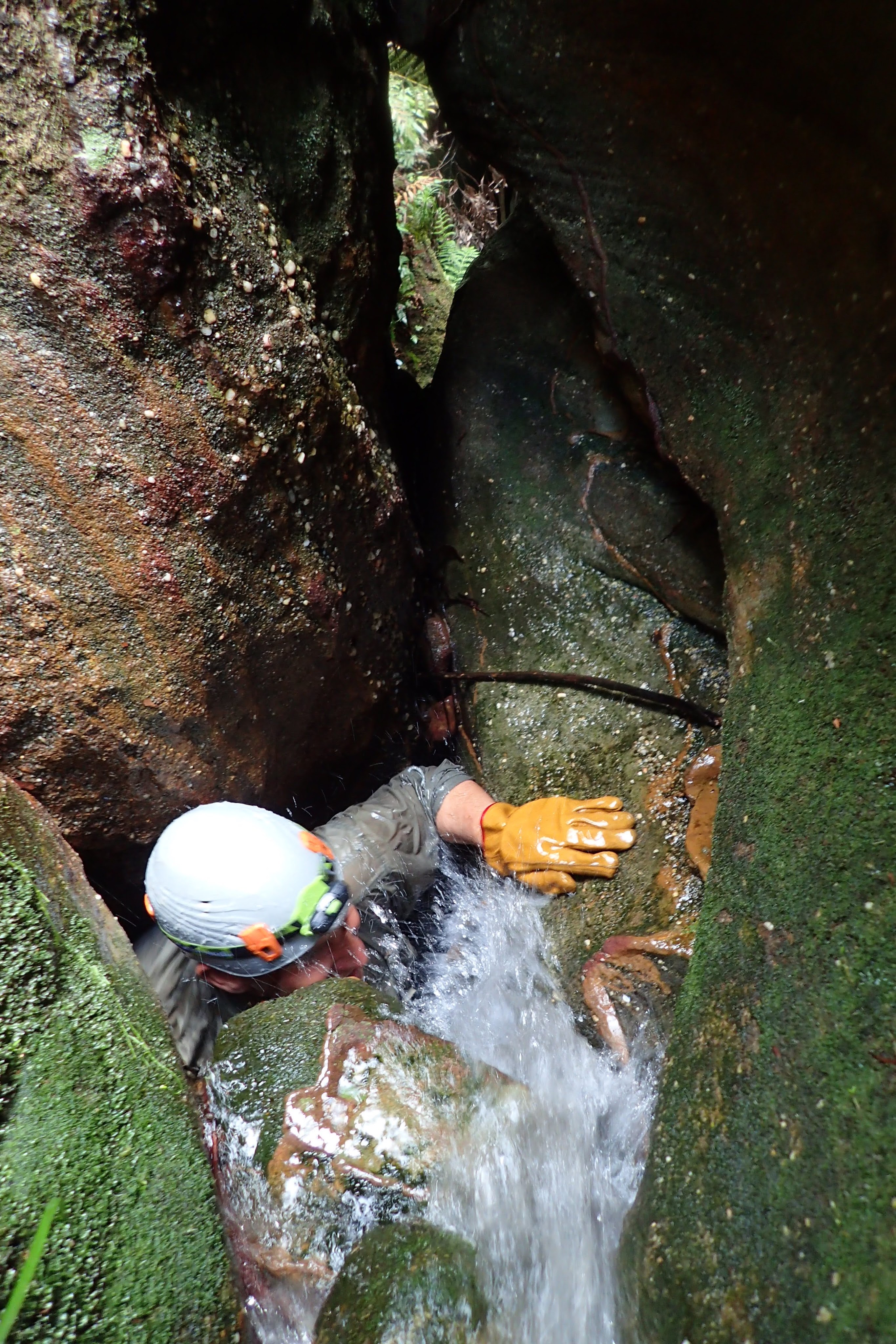 Looking at it more carefully I thought that perhaps it was doable. Trying from the right, I then switched to the left (to stay dry). Testing the rock a whole chunk broke off landing on my other hand. Youch! It wasn’t too bad. Just some bruising and a little broken skin. Hands searched for holds and I felt somewhat confident. Sure enough to give it a crack. Returning for my helmet, I kiwi-coiled some rope about me and went for it. I got my feet up and moved up to the sloping bit of the falls with more confidence. Blinded by water, I tried shielding my eyes, but couldn’t see much. Somewhat blindly I groped for holds and soon managed to scramble carefully out the rest of the climb. There was a decent anchor a ways back so a longer rope was pulled up, secured, and periodic butterflies introduced. I dropped back down the last bit to grab some photos.