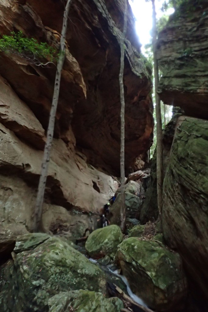 Dropping down the other side we dropped into Fireball Ck and encountered the first small drop fairly quickly. Leading everyone along a ledge, we dropped back in thus avoiding a potential abseil. A gentle sloping drop followed. I down-climbed. I recall David and I using roots to avoid the pool at the bottom, but couldn’t really swing it this time, and was a little too short to bridge. Maybe last time we also went through the water too?